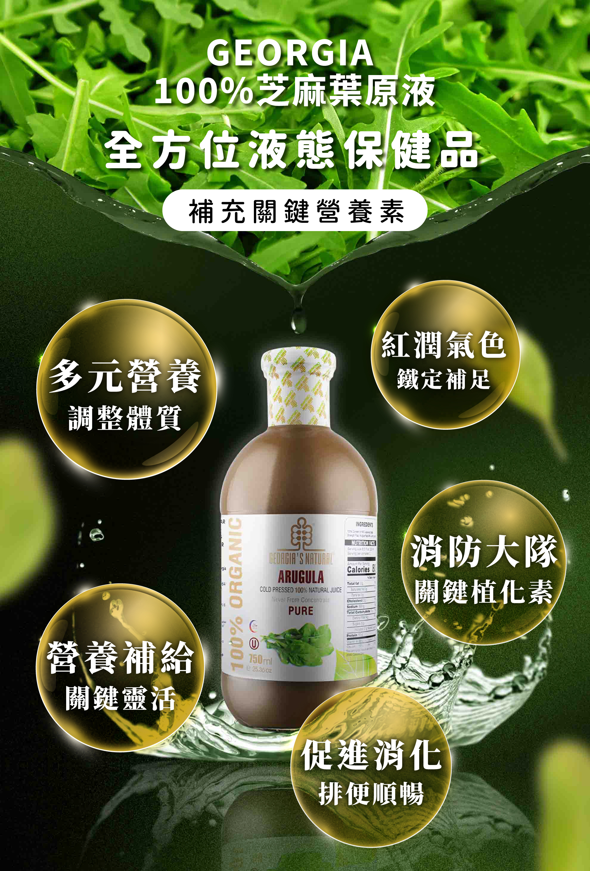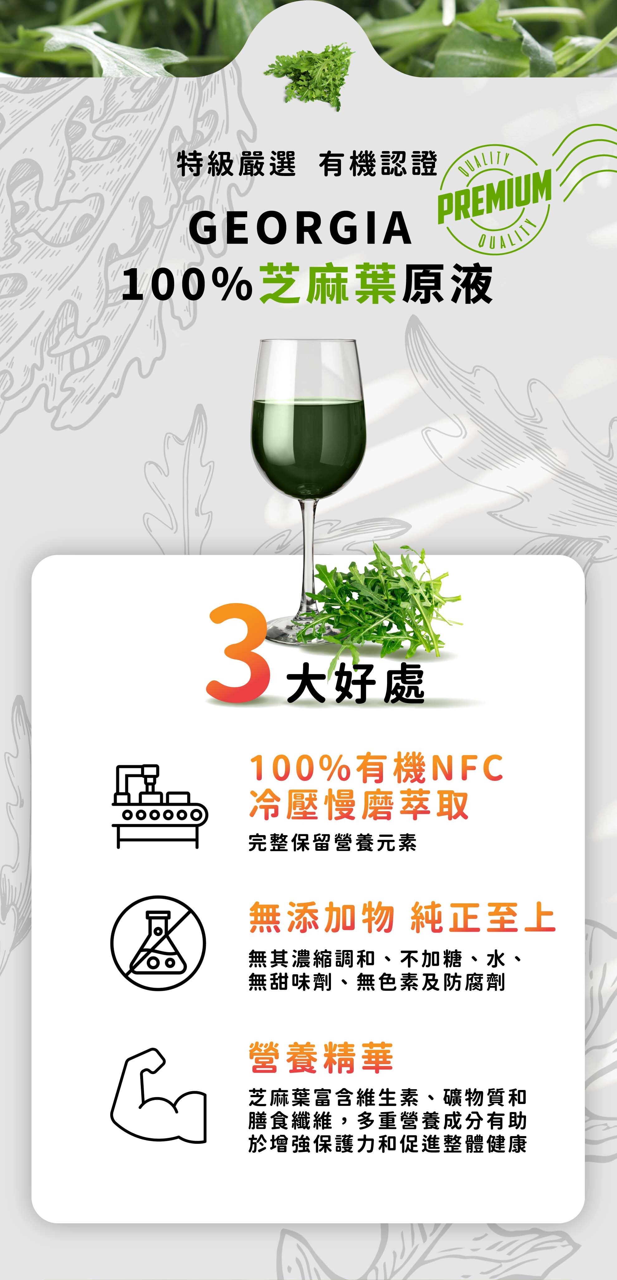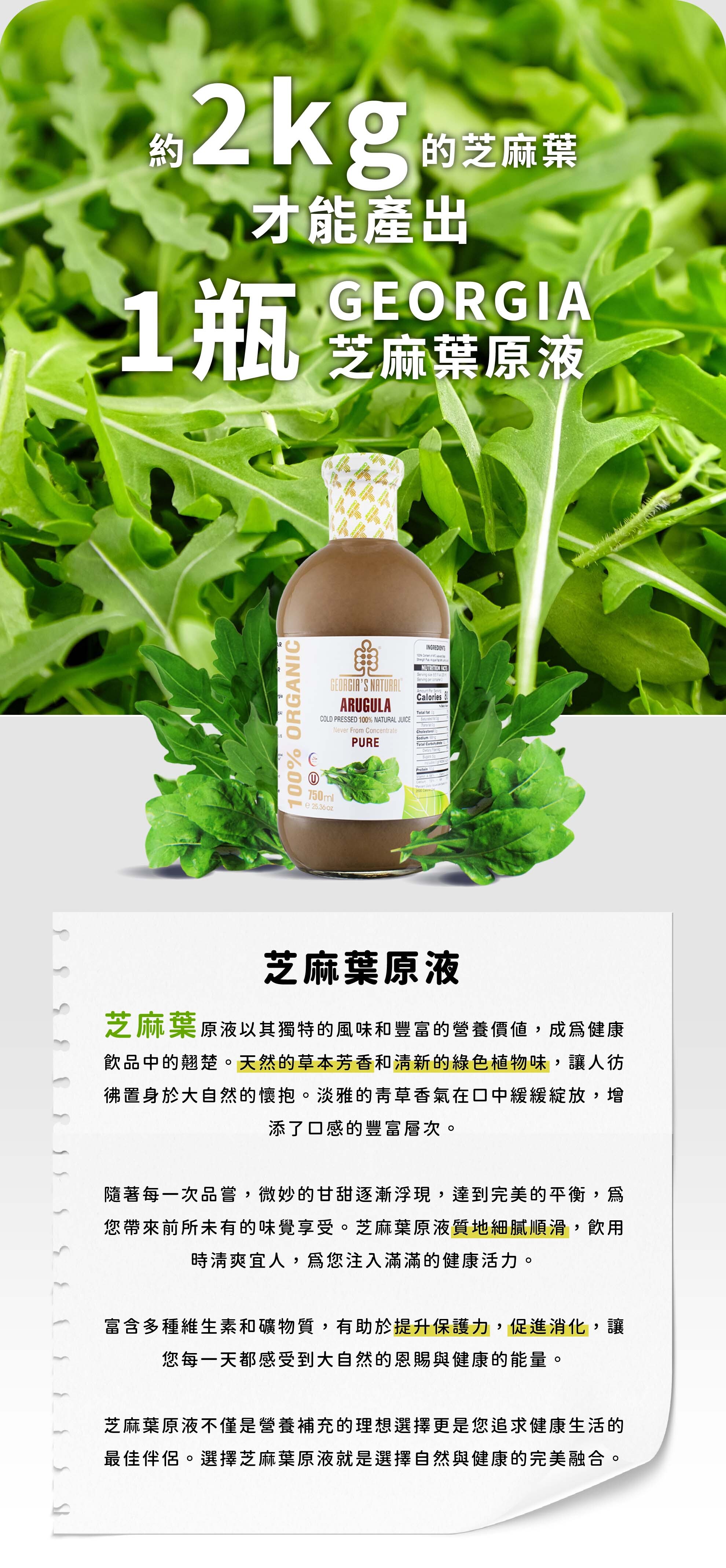 芝麻葉汁是市面極少見的蔬菜汁,芝麻葉屬於十字花科蔬菜,與羽衣甘藍齊名,特有蘿蔔硫素屬高硫化蔬菜,含有維生素K、A、鎂、鈣、葉黃素、B群的超級食物,喬治亞原裝玻璃瓶芝麻葉汁,一瓶含2公斤精華,選用高加索山食材冷壓鮮榨,入口清新無臭味,長期飲用健康維持。