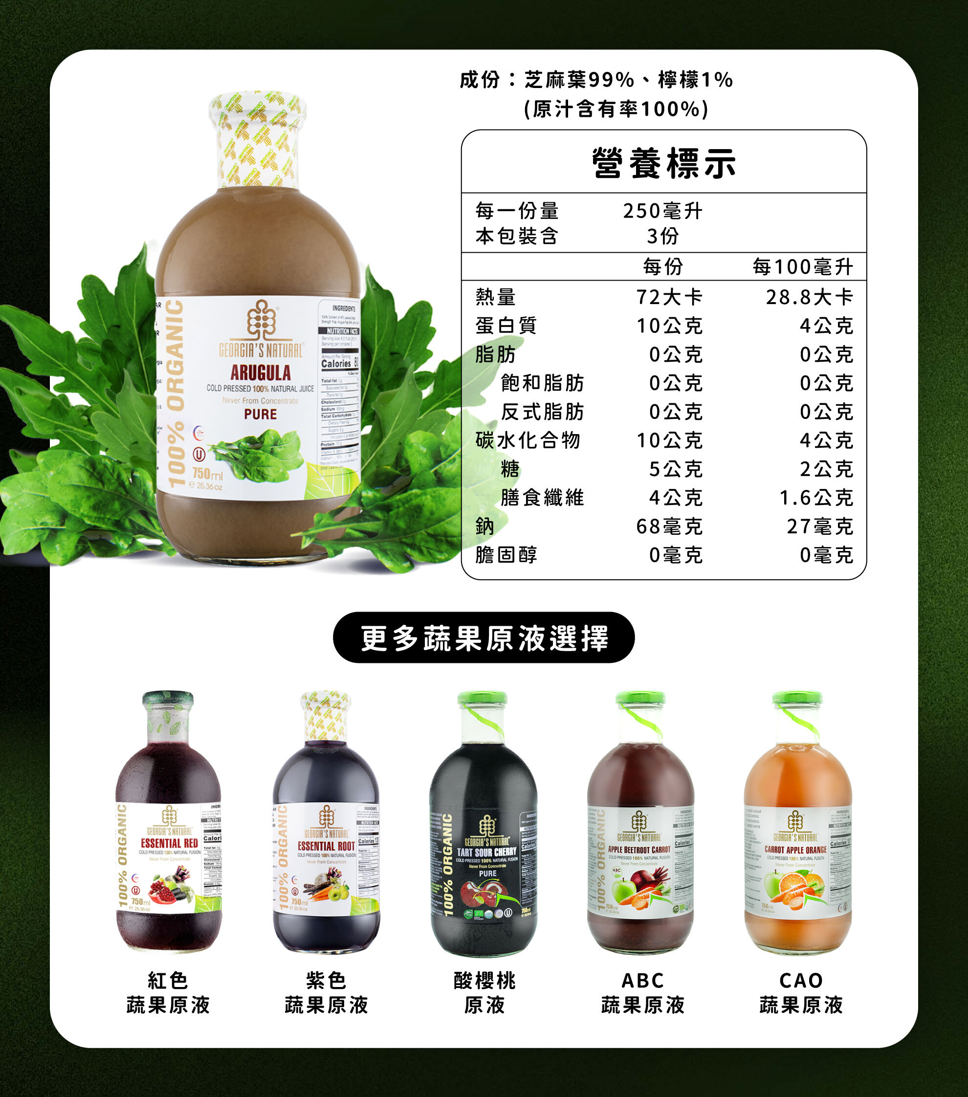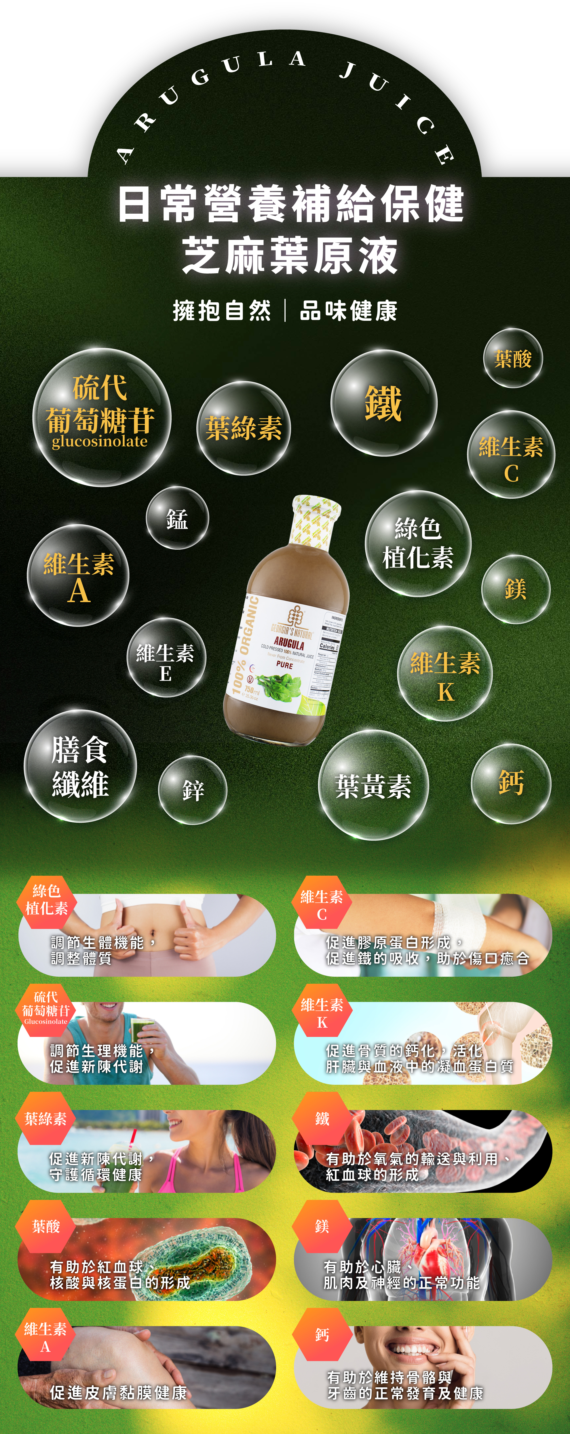 無加糖、無加水、非濃縮,蔬果含量100%原汁,每日補充100毫升補足綠蔬菜營養,可與綜合蔬果汁或是水果汁混合飲用,也可搭配輕斷食,每天飲用十字花科蔬果植化營養,液態吸收快,每日蔬果養生保健,全家都能飲用。