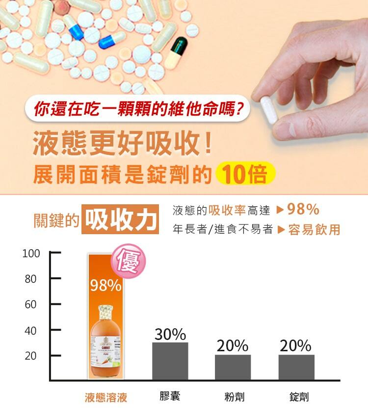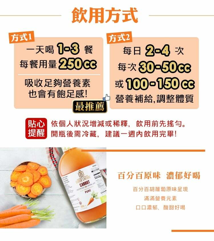 無加糖、無加水、非濃縮果汁,每日補充100毫升補足蔬菜營養,也可與綜合蔬果汁或是水果汁混合飲用,或是搭配執行輕斷食首選,每天飲用多元蔬果植化營養素,液態好吸收,每日蔬果養生保健,調整體質、生理機能,全家都能飲用。