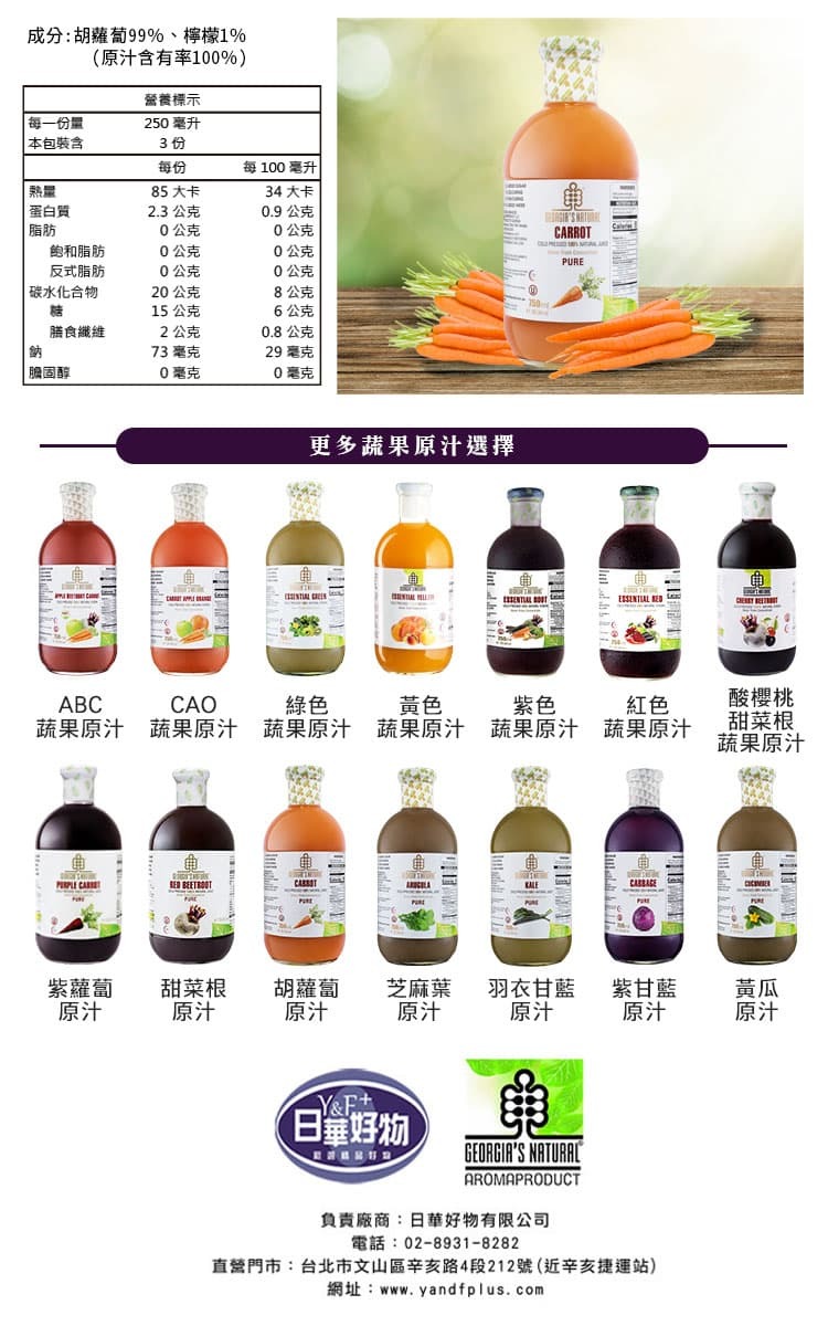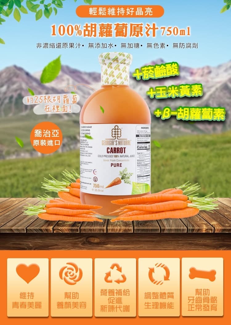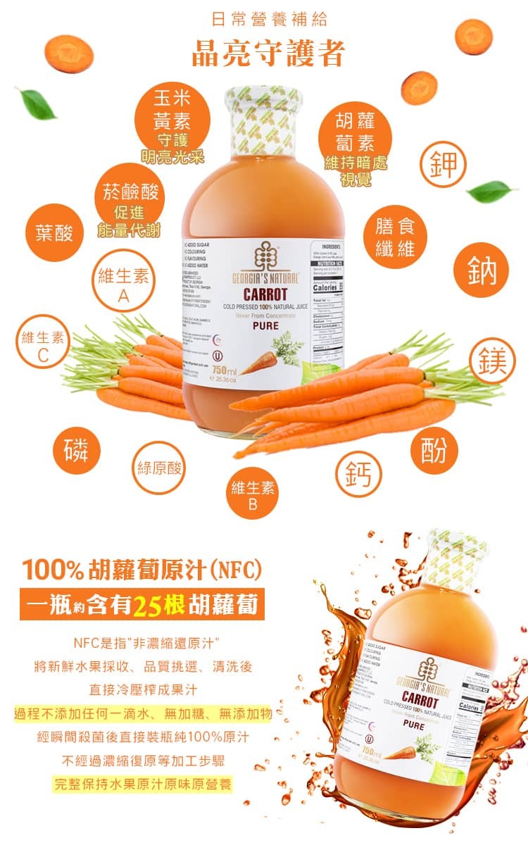 有東方人蔘美稱的胡蘿蔔,富含胡蘿蔔素、纖維、鐵、鈣、硒、維生素E以及多種酵素,選用高加索山有機胡蘿蔔冷壓鮮榨胡蘿蔔汁,一瓶含25根胡蘿蔔純粹精華,蔬果含量100%純胡蘿蔔原汁,喬治亞原裝玻璃瓶進口,入口清甜果香味,長期飲用有助健康維持。