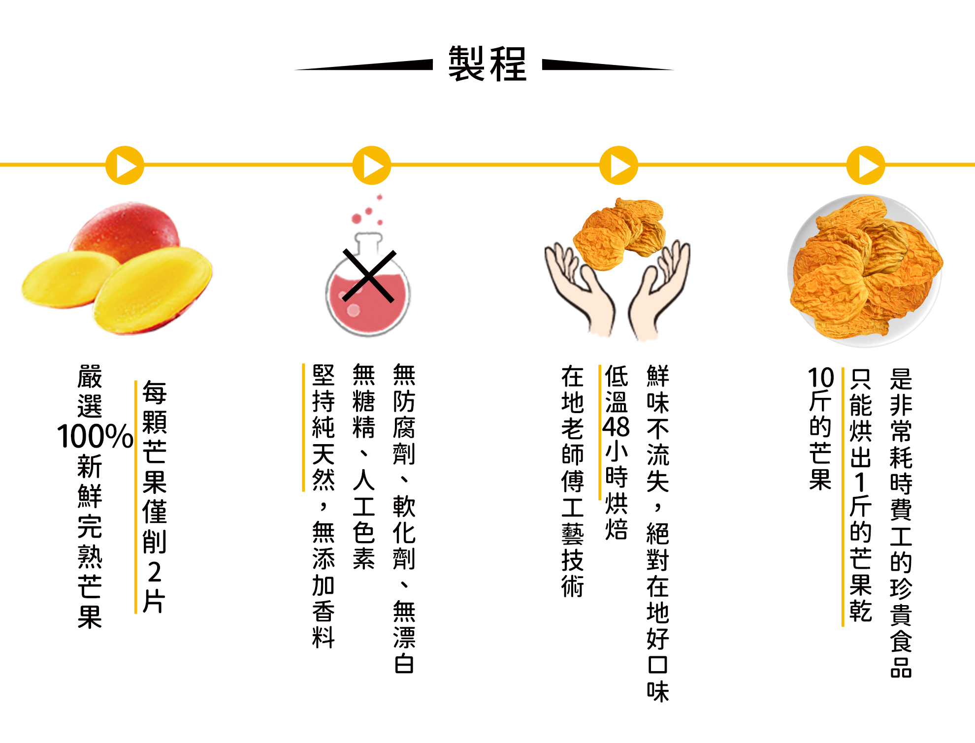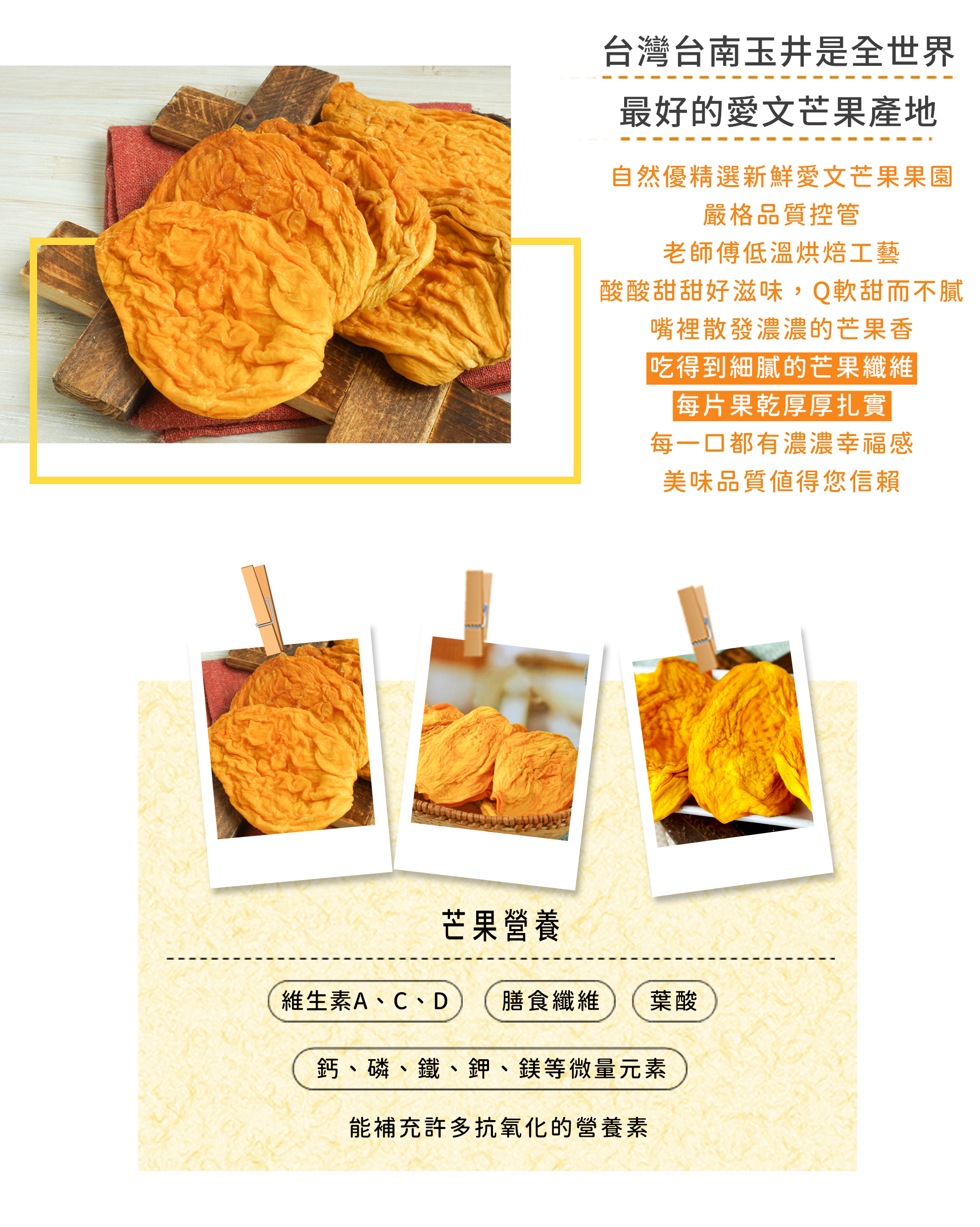 台灣水果中以愛文芒果最為出名,尤其愛文芒果乾更是網購或是旅客必買的零食。一顆芒果僅能烘焙兩片芒果乾,無加糖芒果乾更需嚴格挑選本身糖度夠的鮮果,嚴選台灣在欉紅自然熟成愛文芒果,48小時低溫烘焙,無添加糖或任何食品添加物,保留鮮果天然風味,營養精華濃縮!紮實口感,讓人愈吃愈喜歡!天然營養又好吃!如果你是喜歡吃芒果乾的人,絕對知道無加糖芒果乾跟糖漬芒果乾的差別。