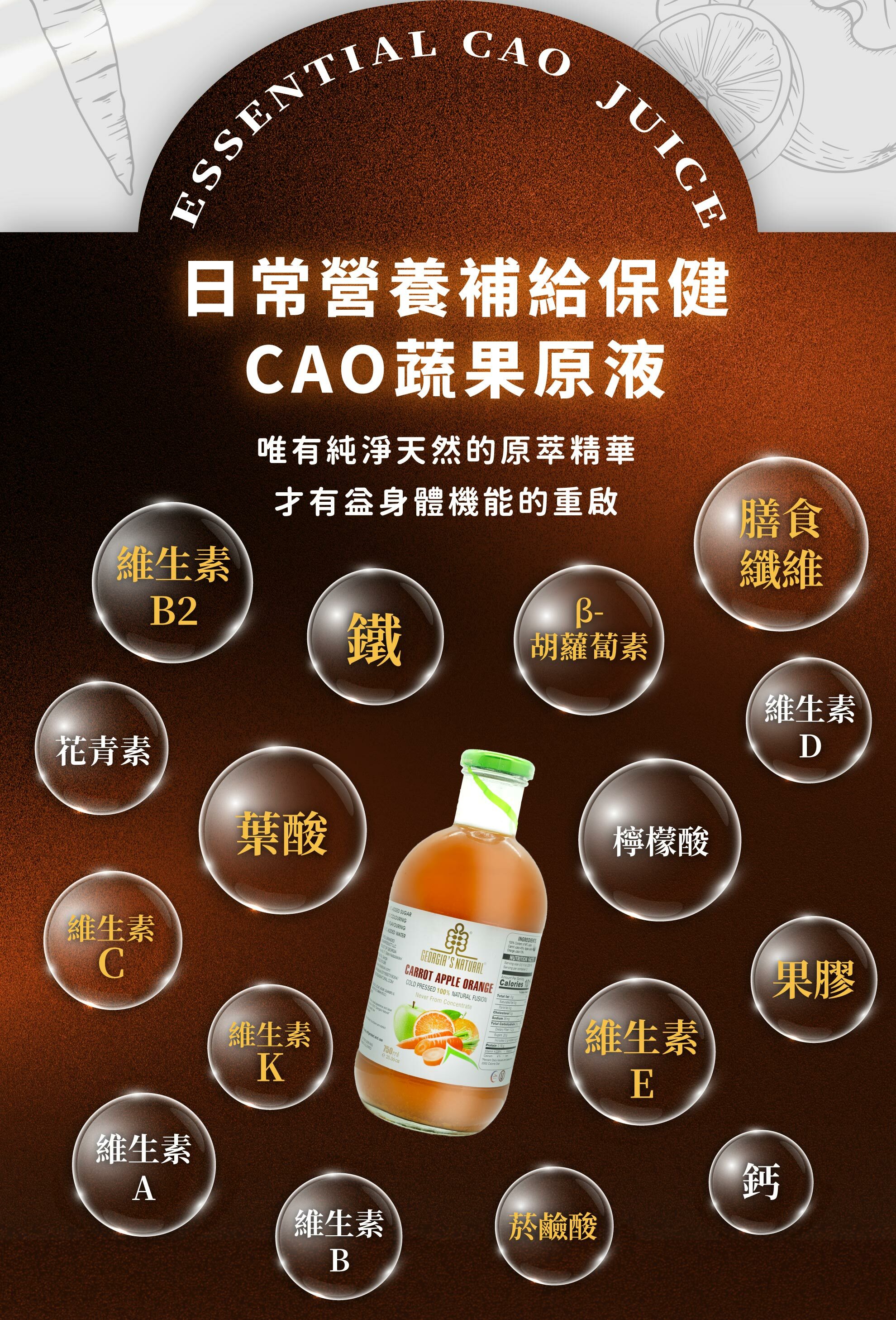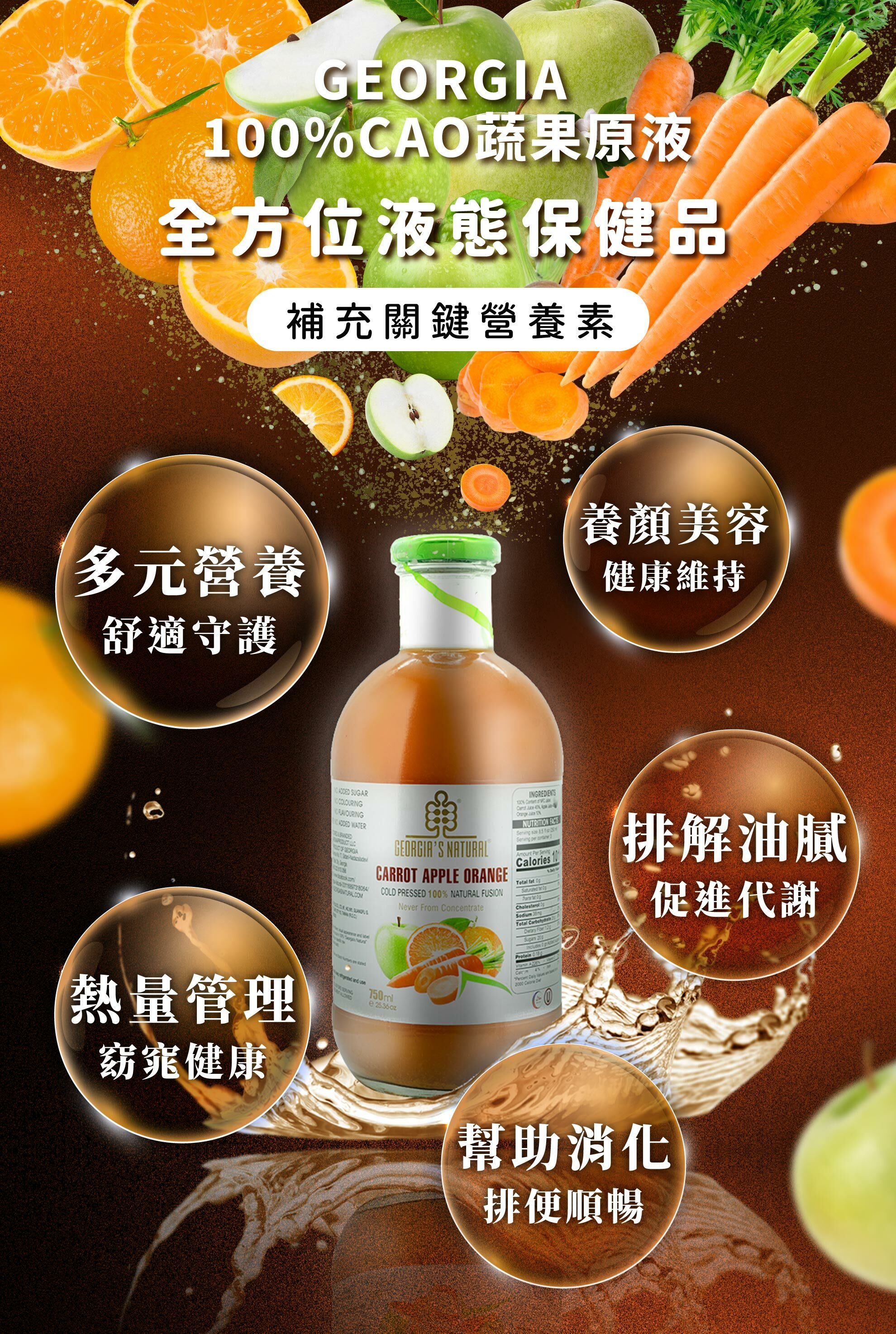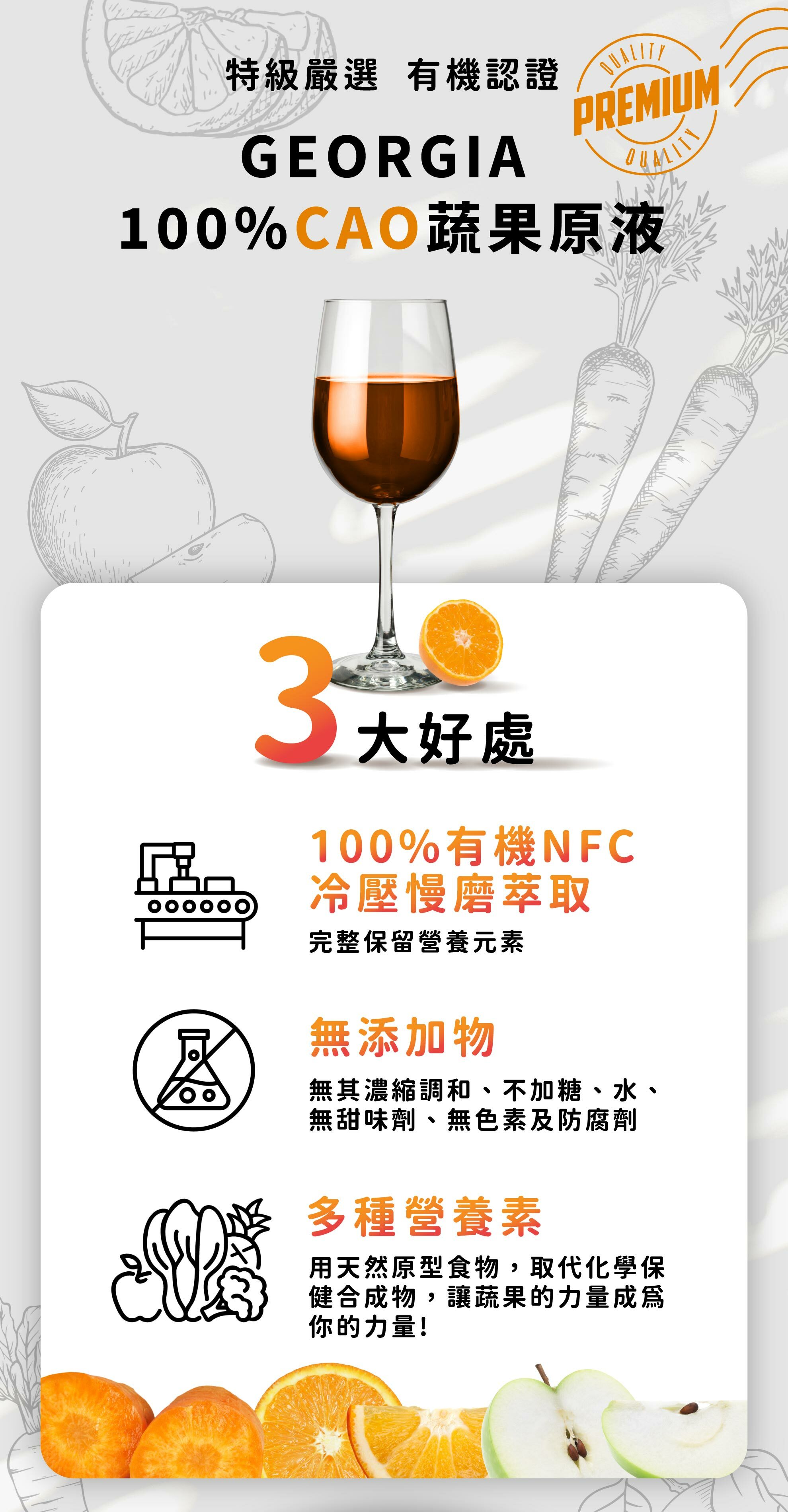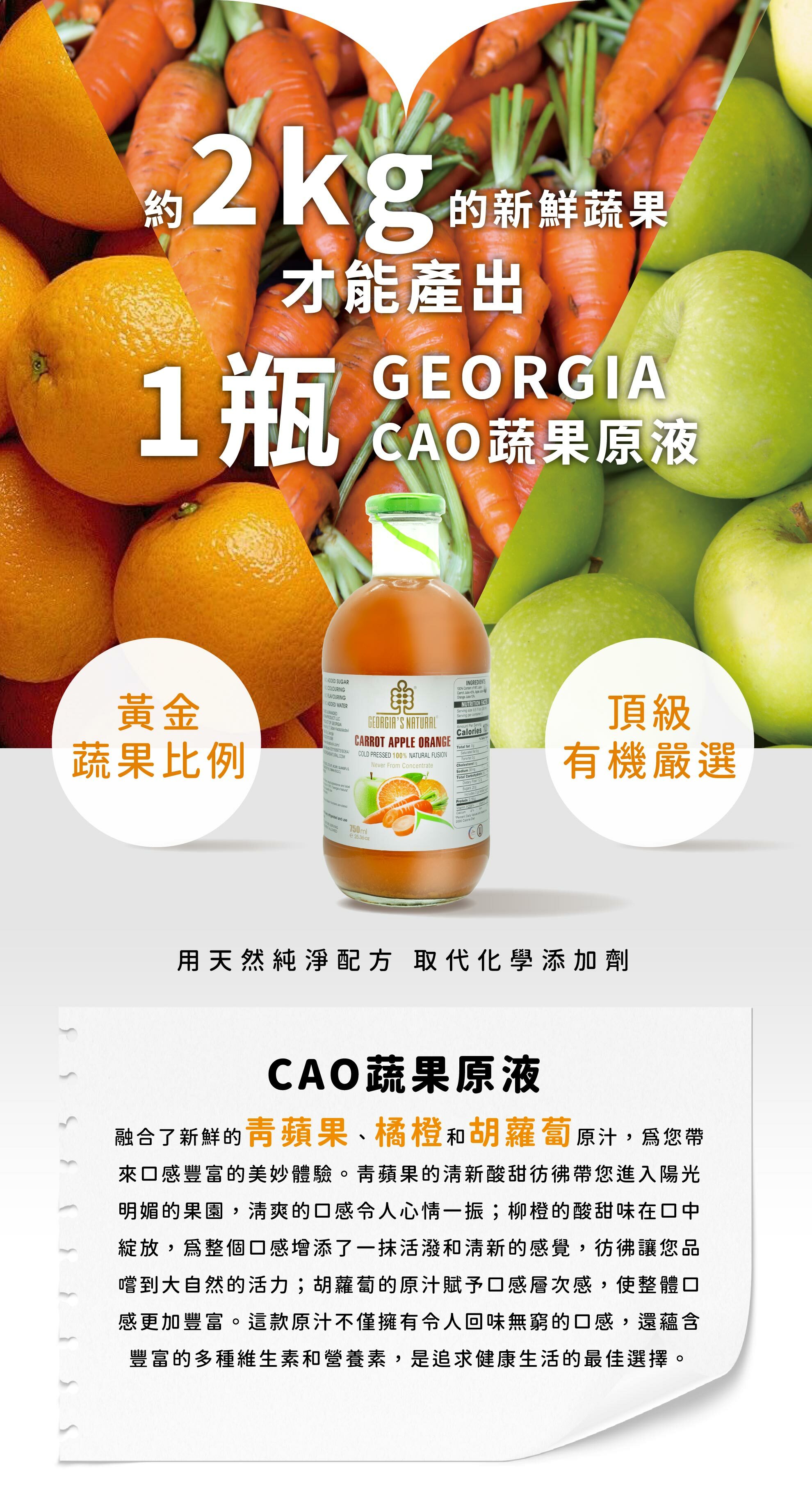 喬治亞原裝玻璃瓶冷壓綜合蔬果汁,CAO蔬果汁一瓶含有2公斤蔬果精華,配方以東方人蔘美稱的胡蘿蔔,搭配青蘋果、橘橙平衡蔬菜比重,選用高加索山新鮮食材榨汁,無加糖、無加水、非濃縮果汁,蔬果含量100%純蔬果原汁,每日補充100毫升補足蔬果營養。