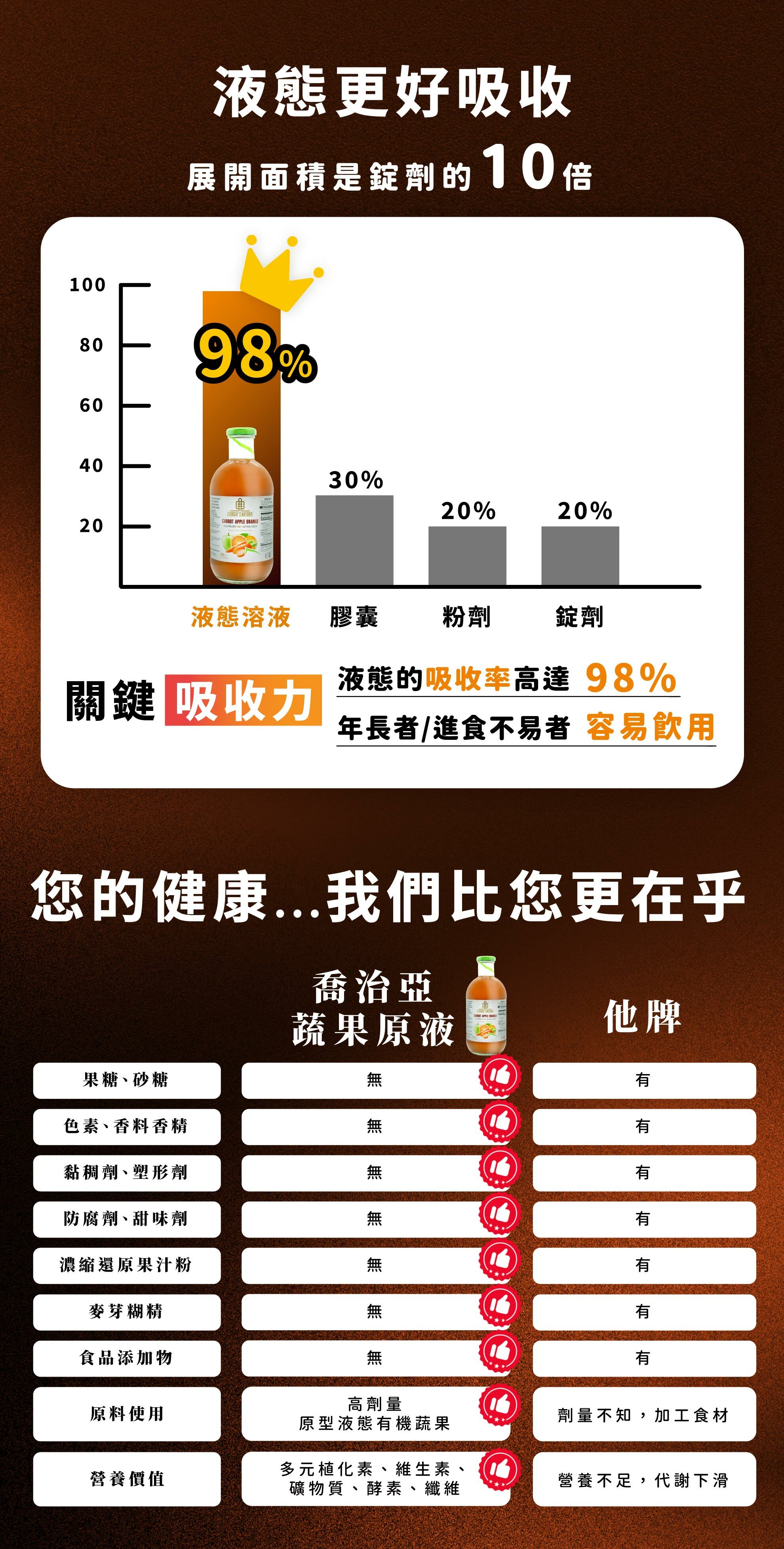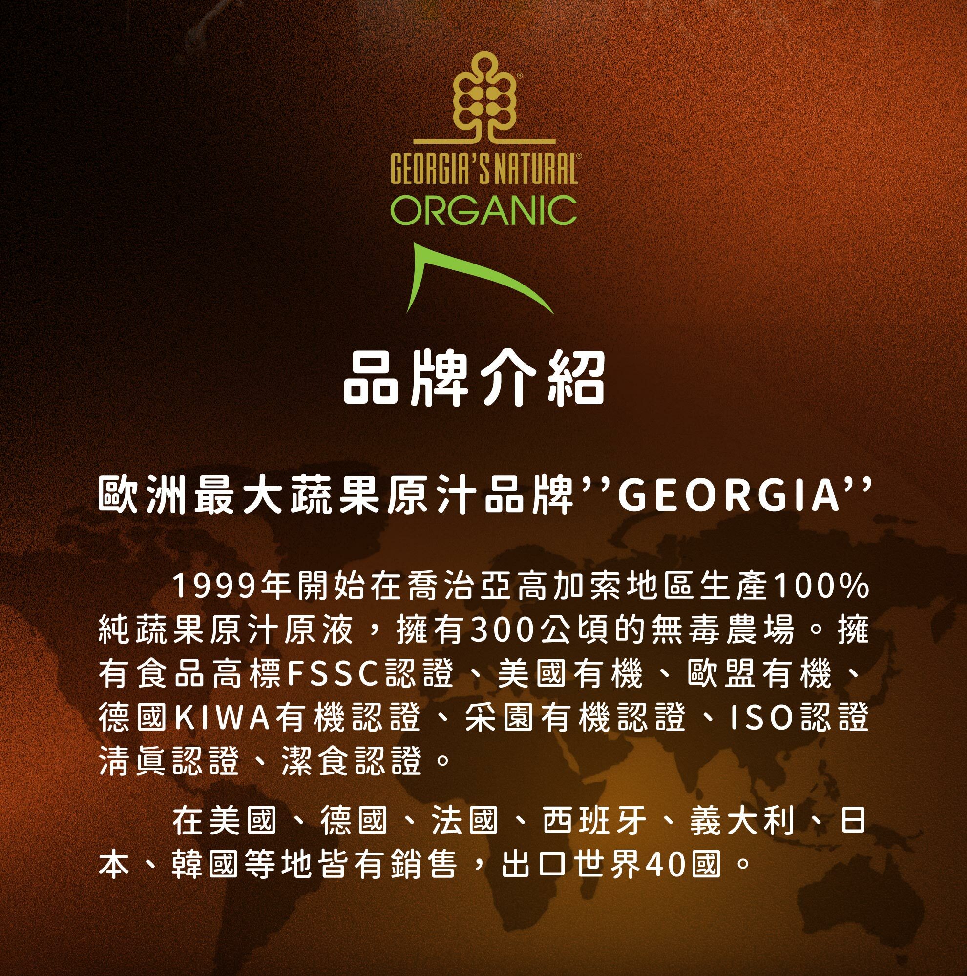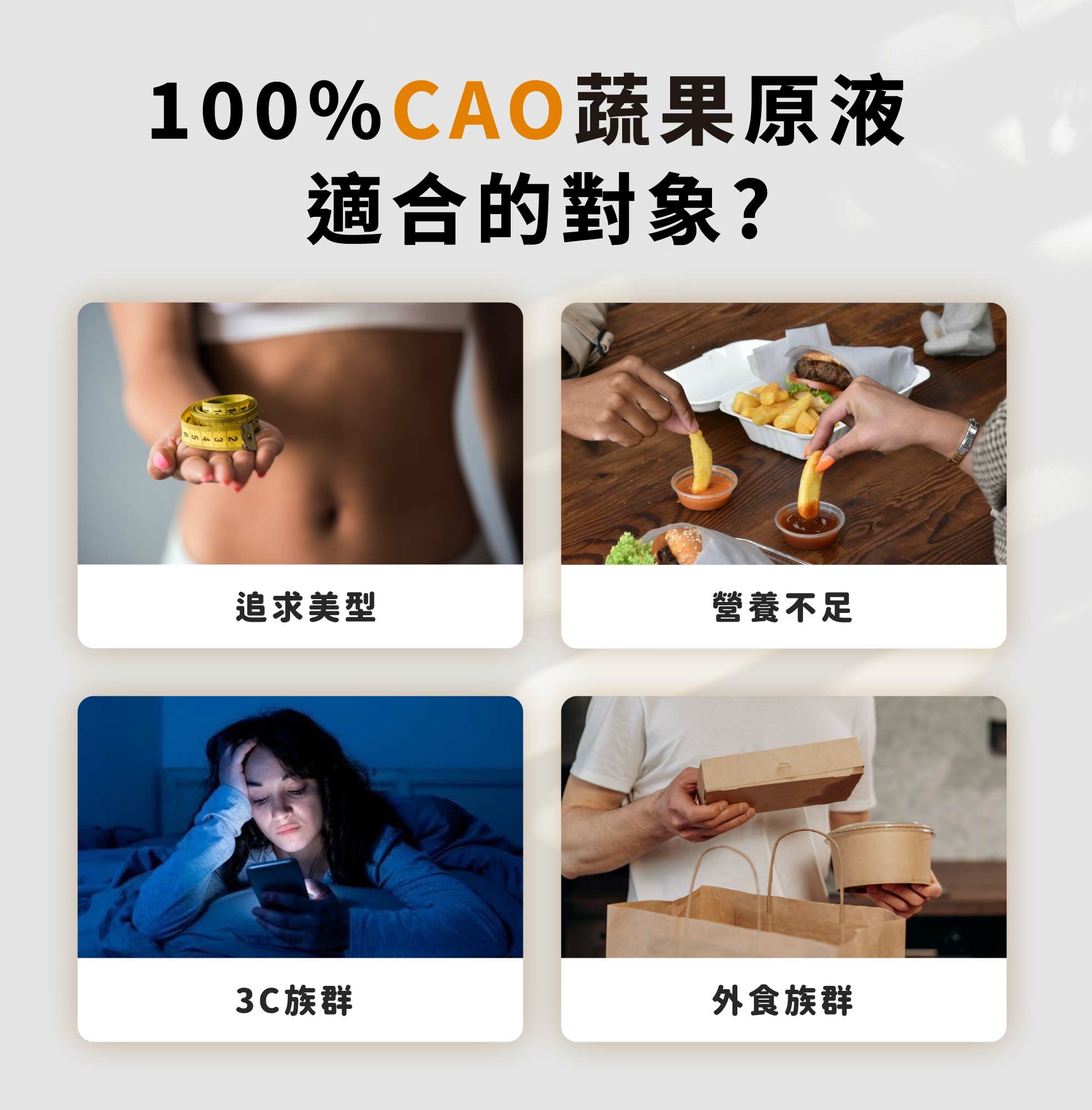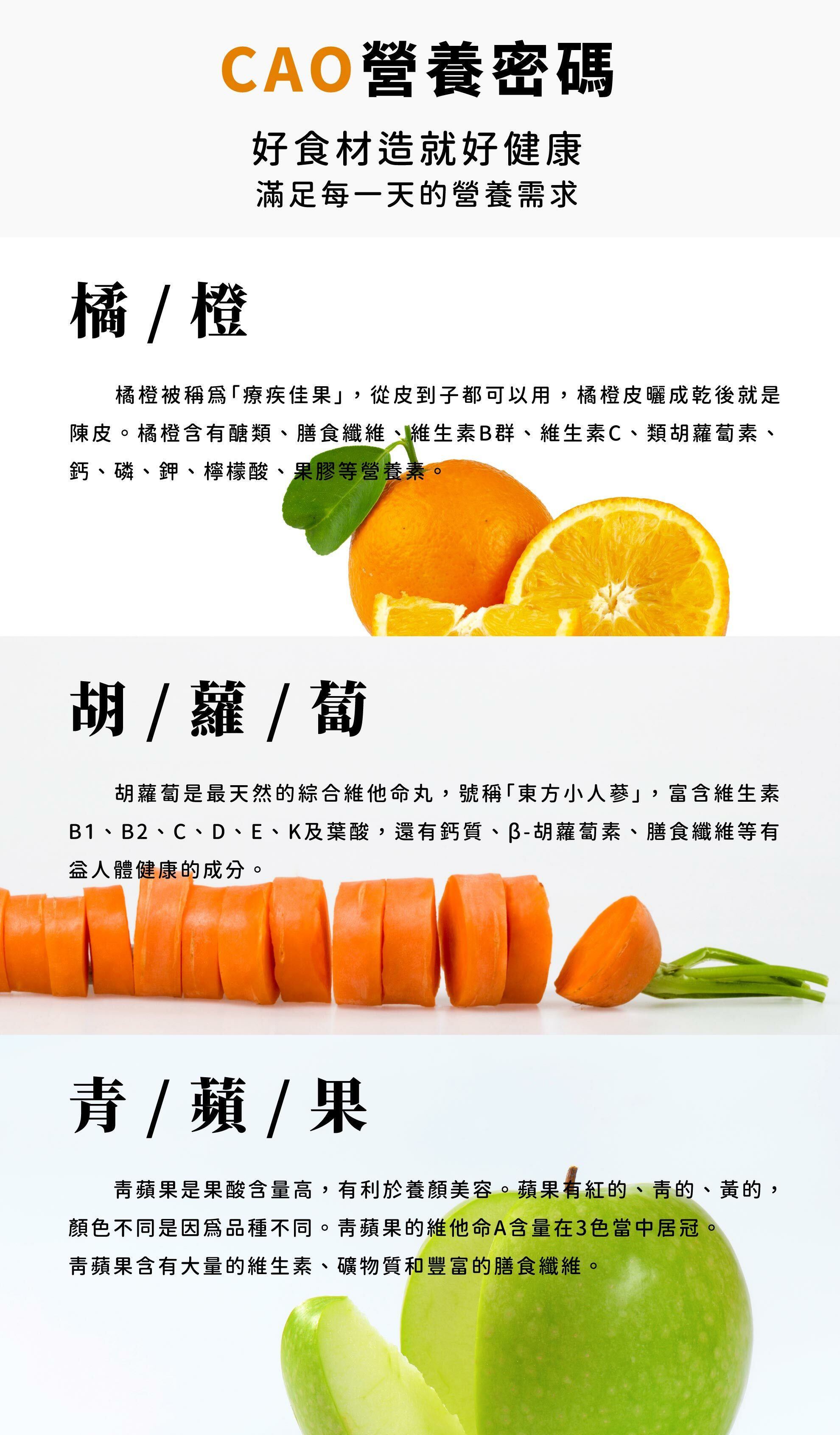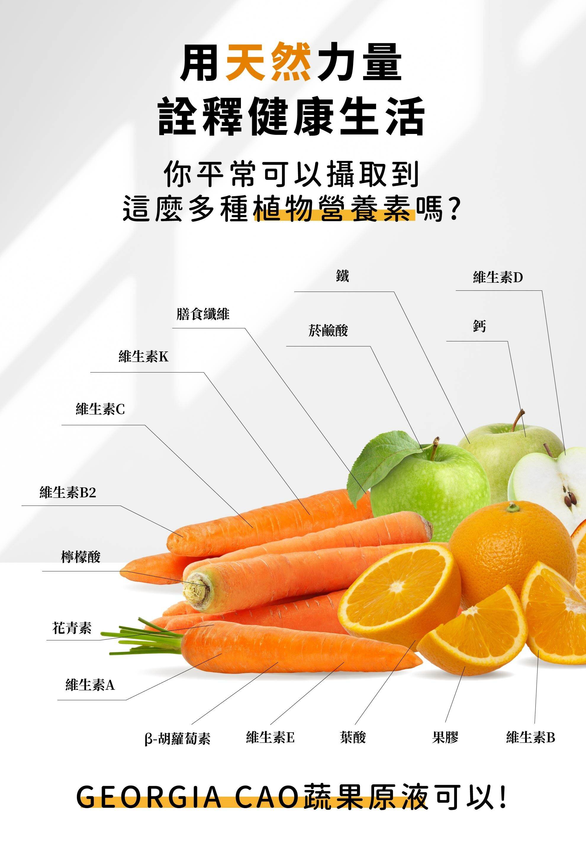 喬治亞原裝玻璃瓶冷壓綜合蔬果汁,CAO蔬果汁一瓶含有2公斤蔬果精華,配方以東方人蔘美稱的胡蘿蔔,搭配青蘋果、橘橙平衡蔬菜比重,選用高加索山新鮮食材榨汁,無加糖、無加水、非濃縮果汁,蔬果含量100%純蔬果原汁,每日補充100毫升補足蔬果營養。