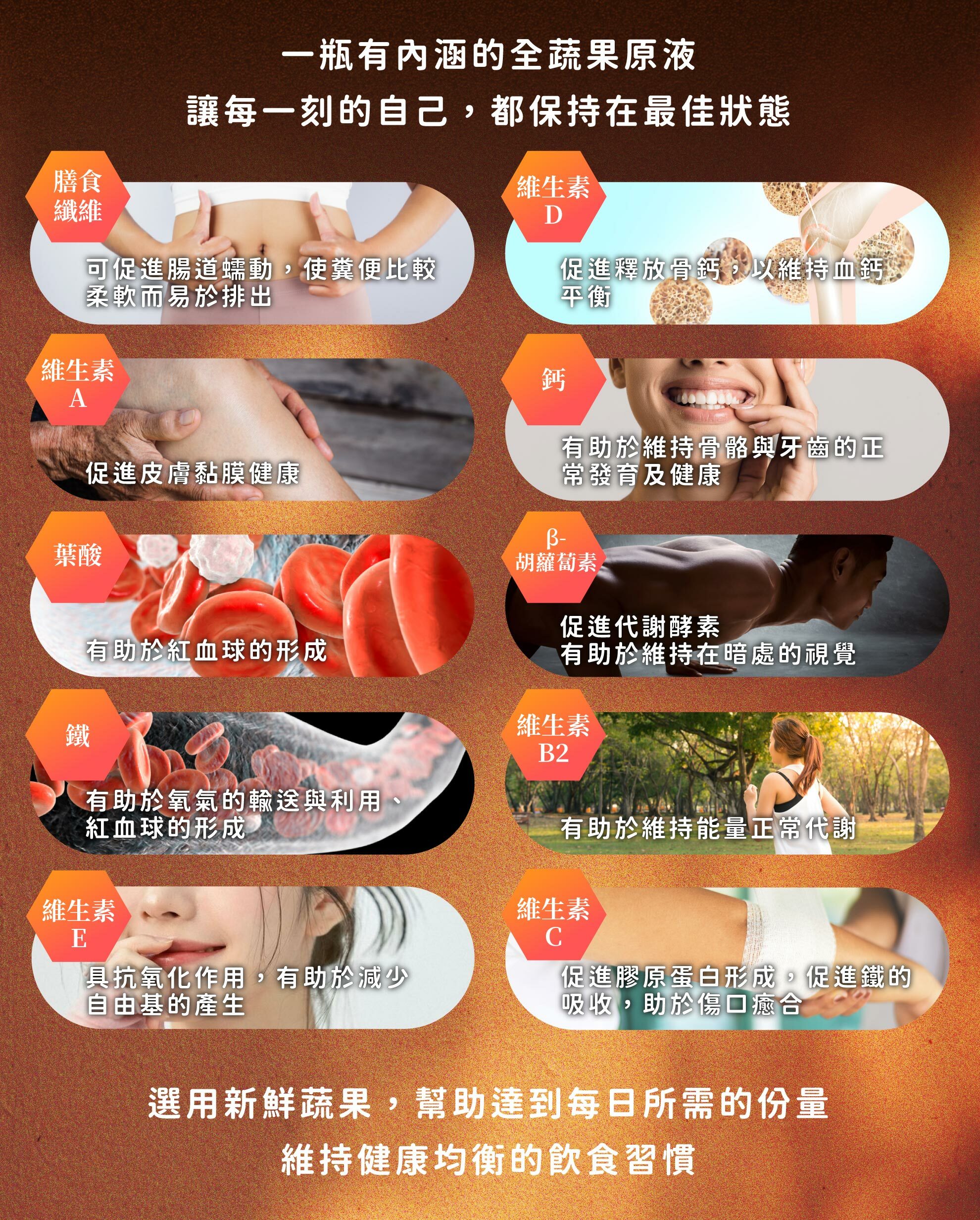 營養團隊根據各類蔬菜水果與莓果的營養與功效監製彩虹蔬果汁,執行輕斷食首選,每天飲用多元蔬果植化營養素,液態吸收快,每日蔬果養生保健調理,調整體質、生理機能,健康維持,全家大小都能飲用。