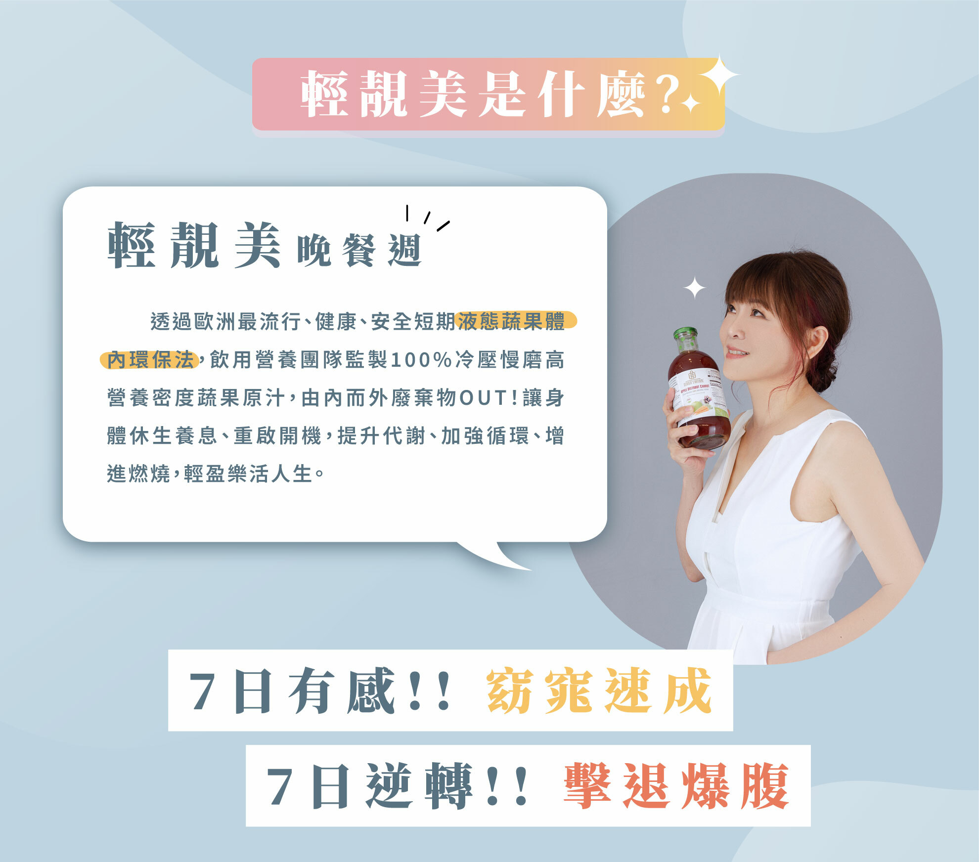 成份:黃瓜、芝麻葉、奇異果、羽衣甘藍、蘋果、西洋梨、薄荷(原汁含有率100%)