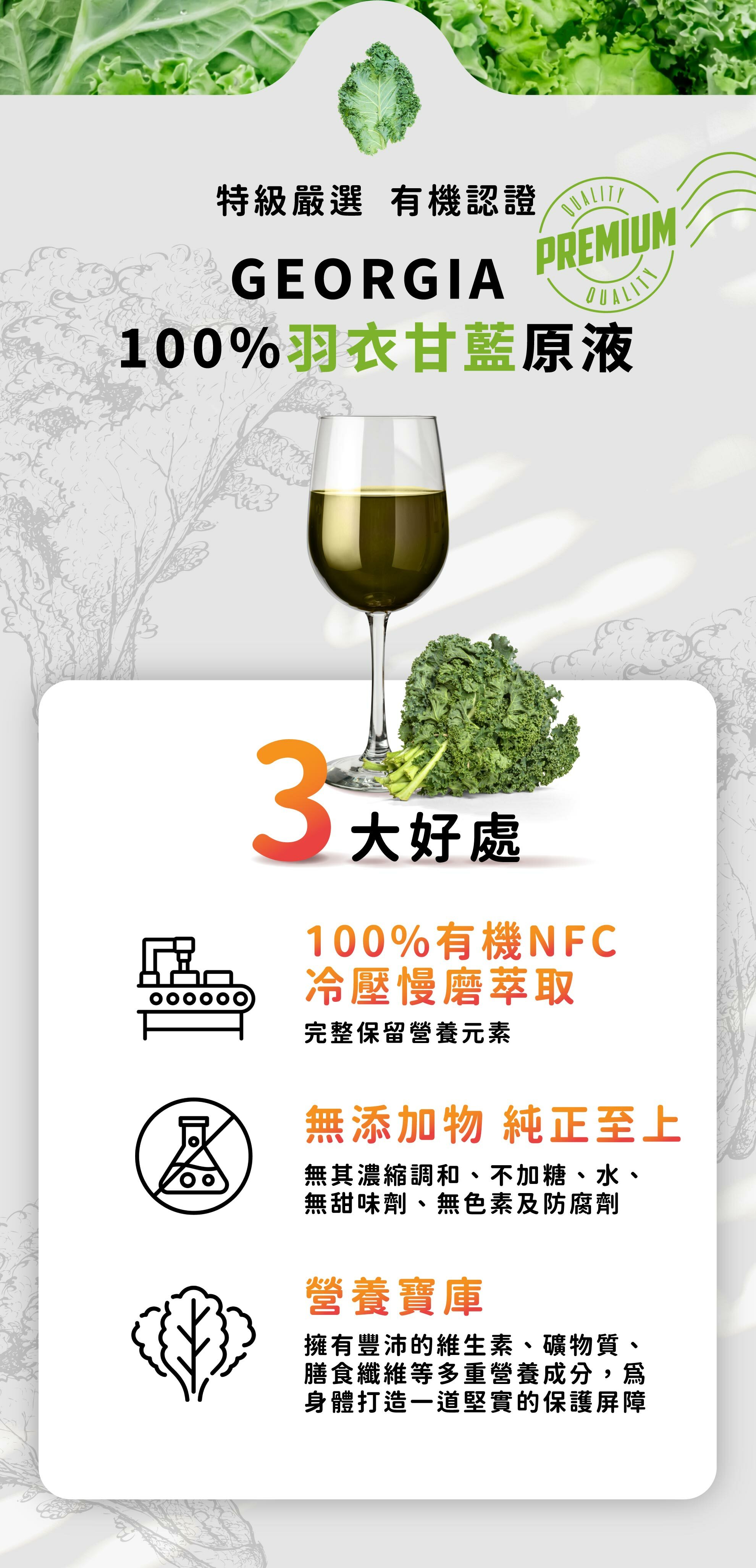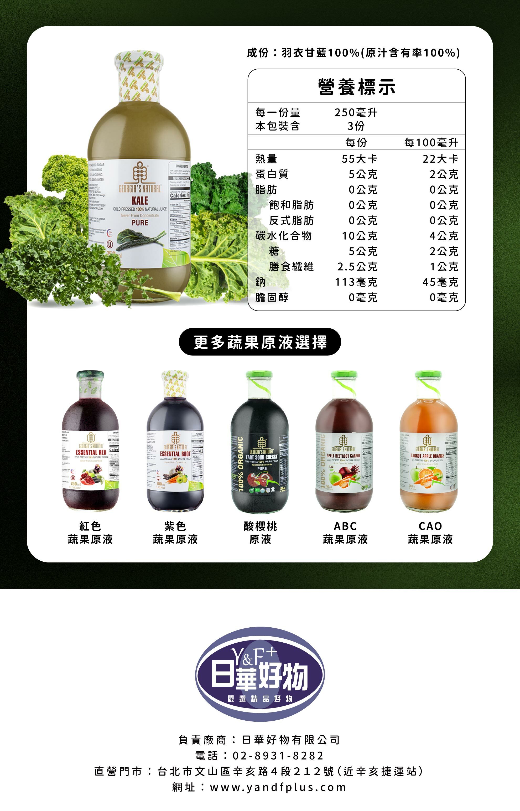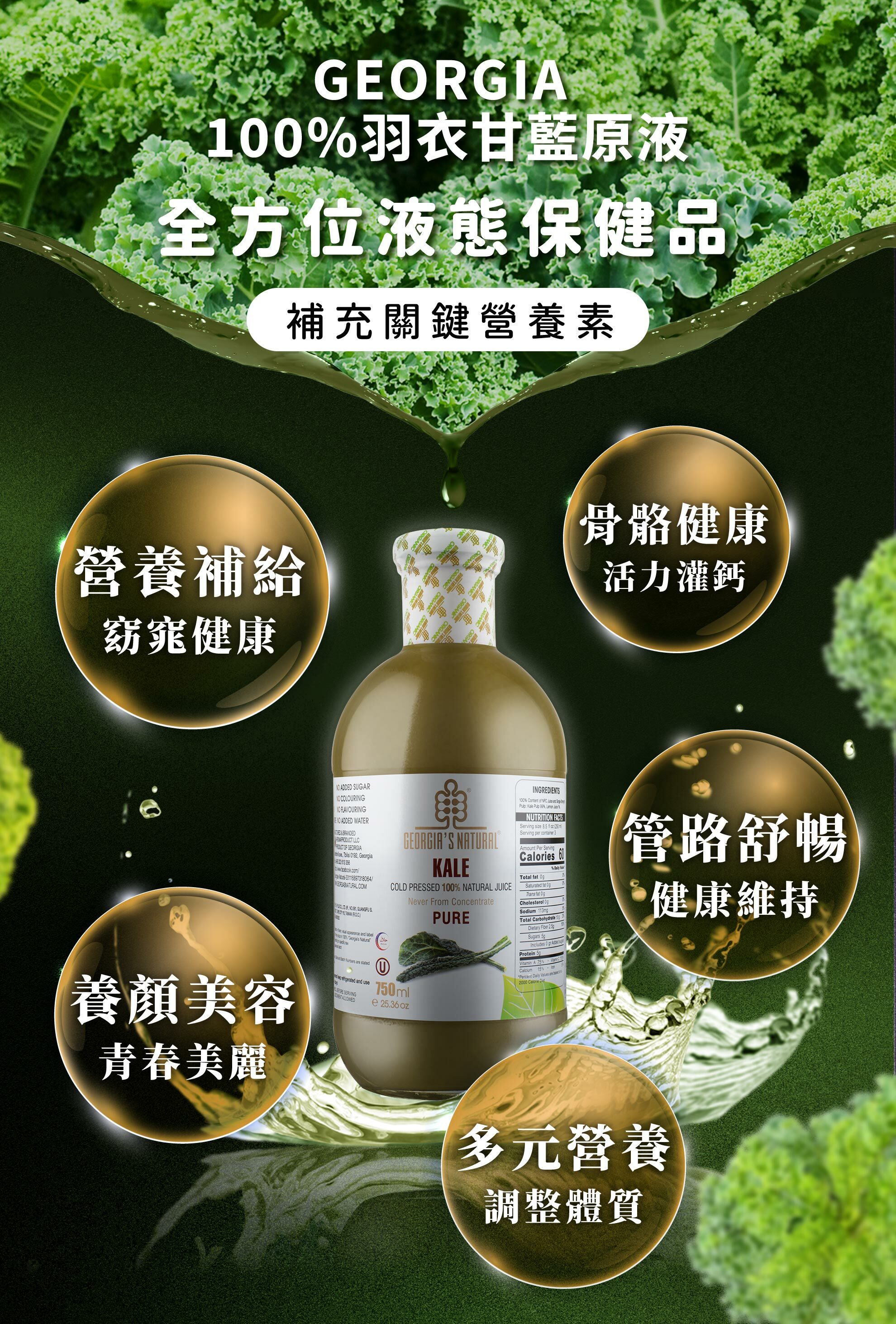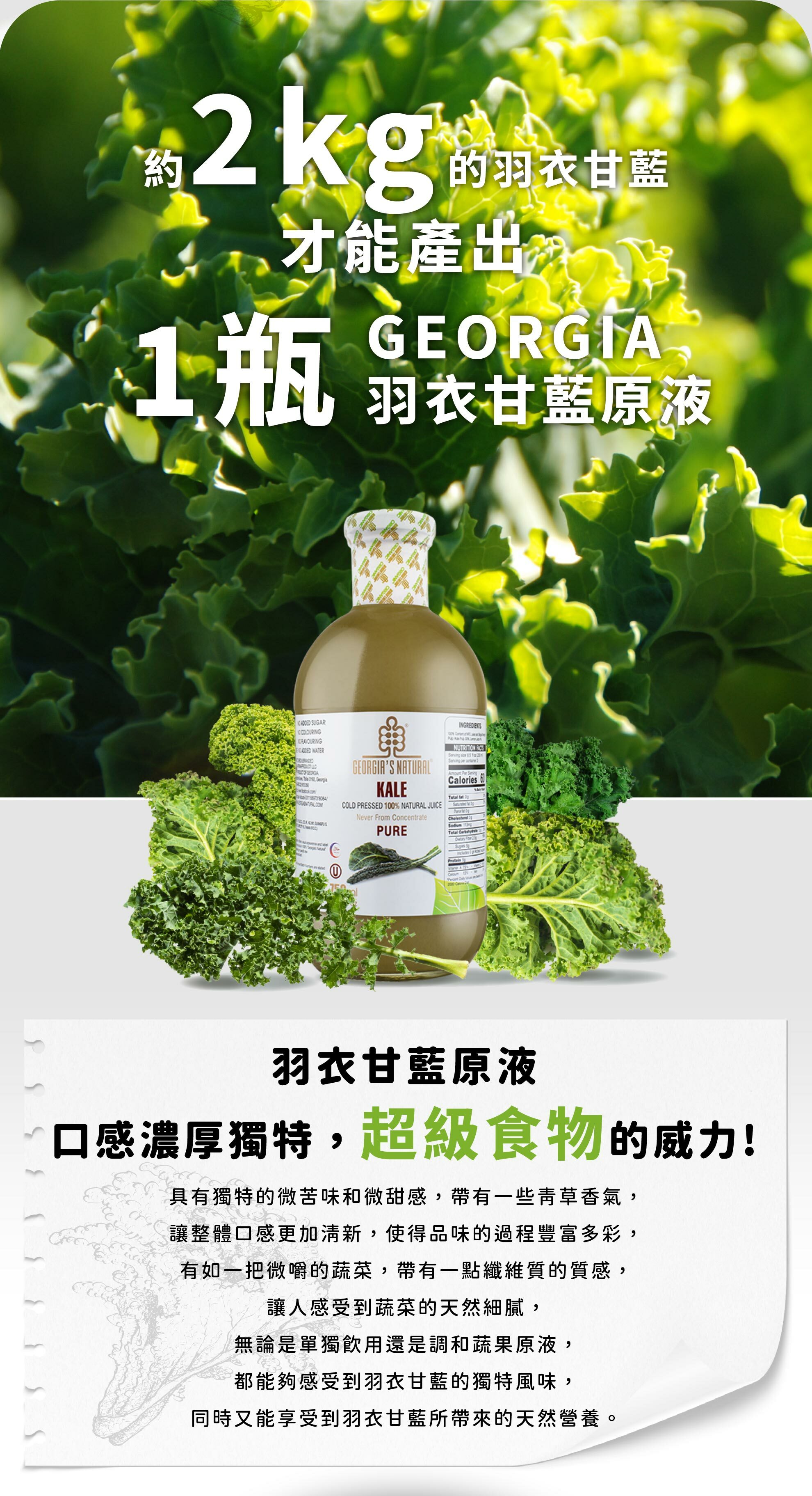 羽衣甘藍屬於十字花科蔬菜超級食物,市售少有的純羽衣甘藍汁,特有的硫化素屬高硫化蔬菜,氣味很濃郁,含有維生素K、A、鎂、鈣、葉黃素、B群的明星食材,喬治亞原裝玻璃瓶羽衣甘藍汁,一瓶含2公斤精華,選用高加索山食材冷壓鮮榨,入口清新微苦,硫化氣味較濃,建議搭配其他款式蔬果汁、水果或莓果汁混合長期飲用,樂活人生。