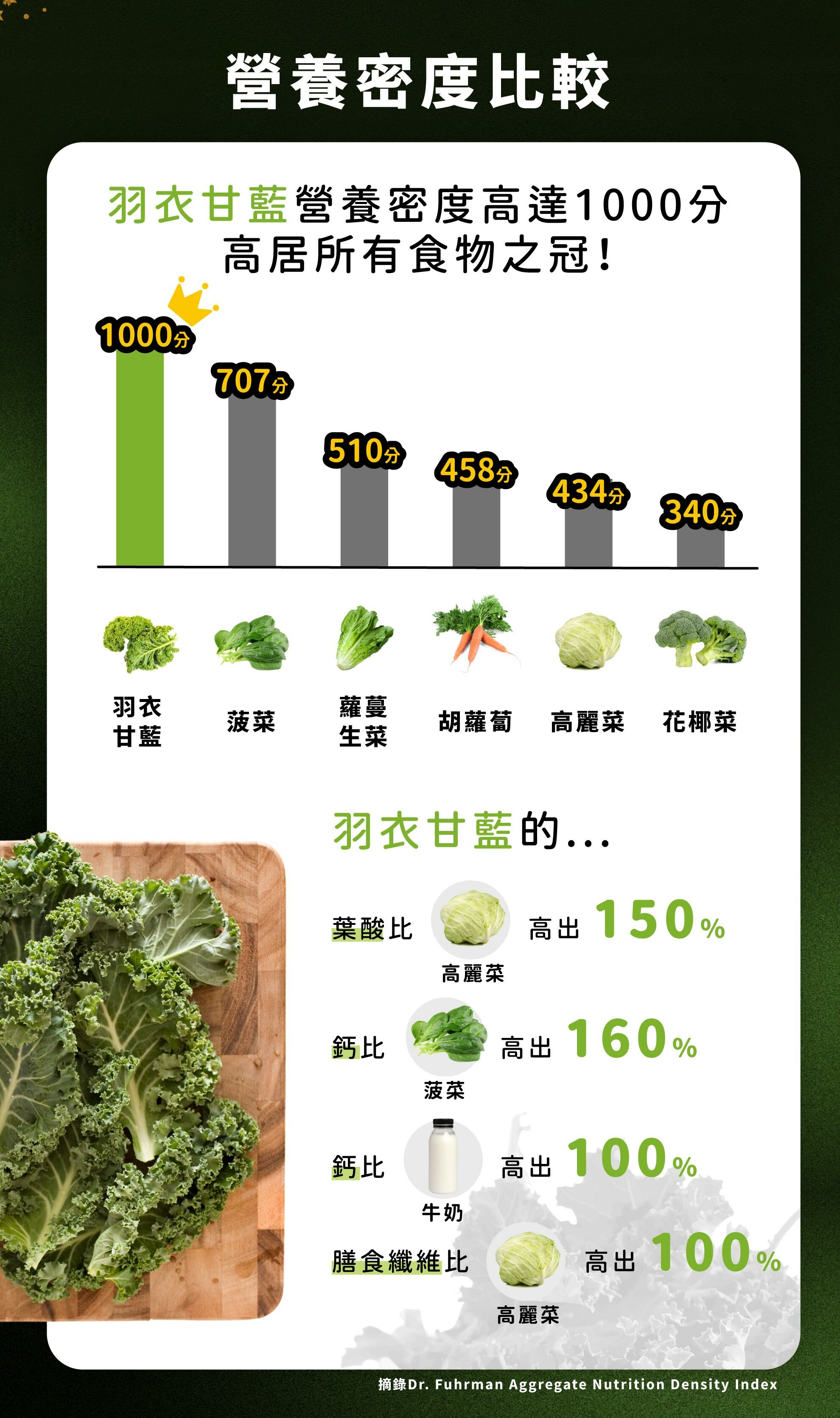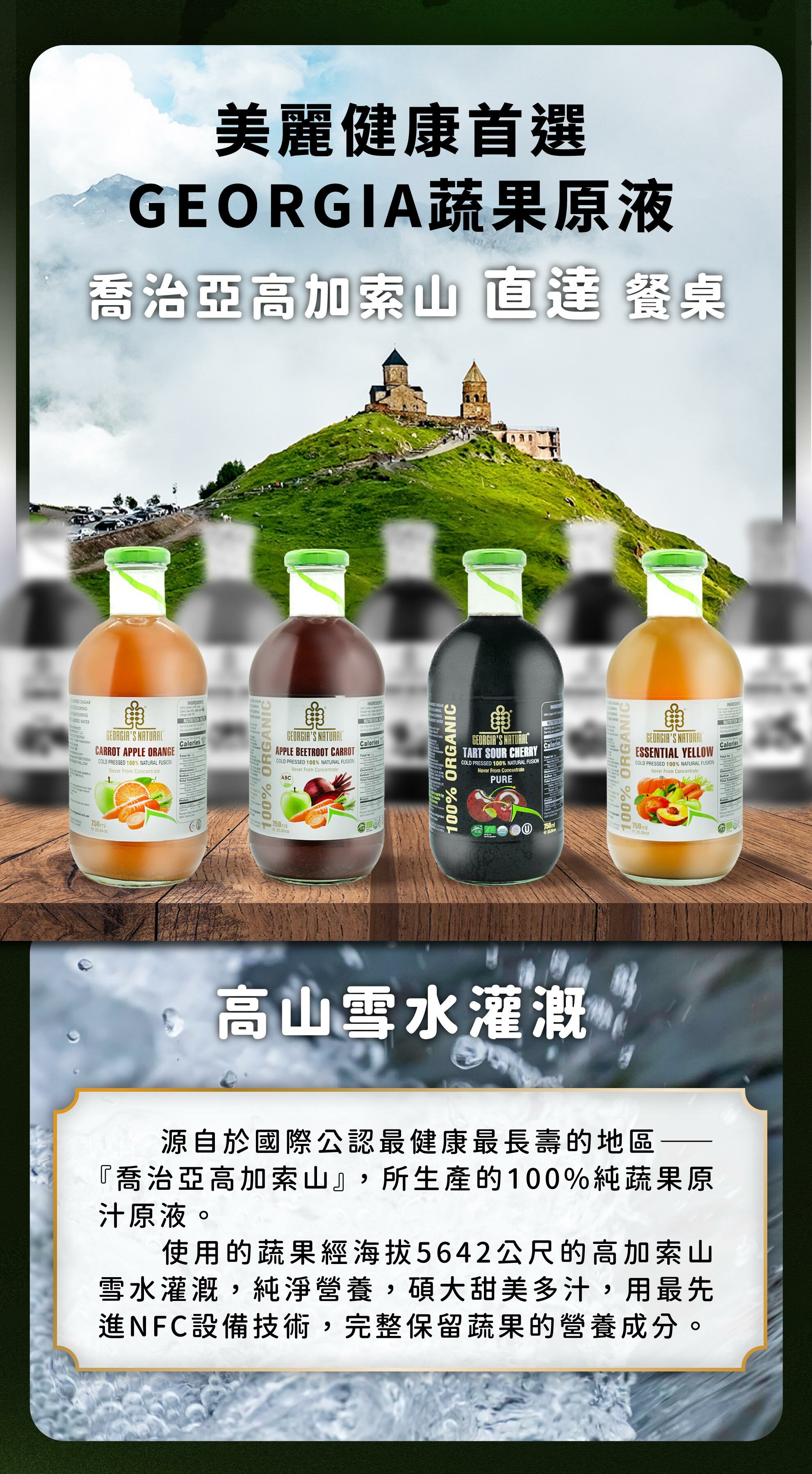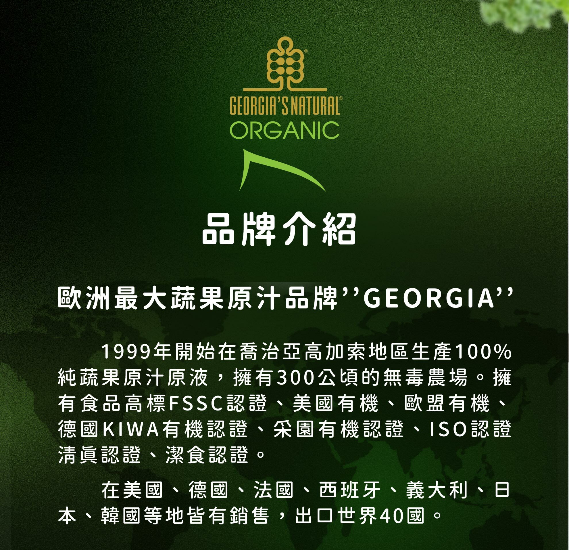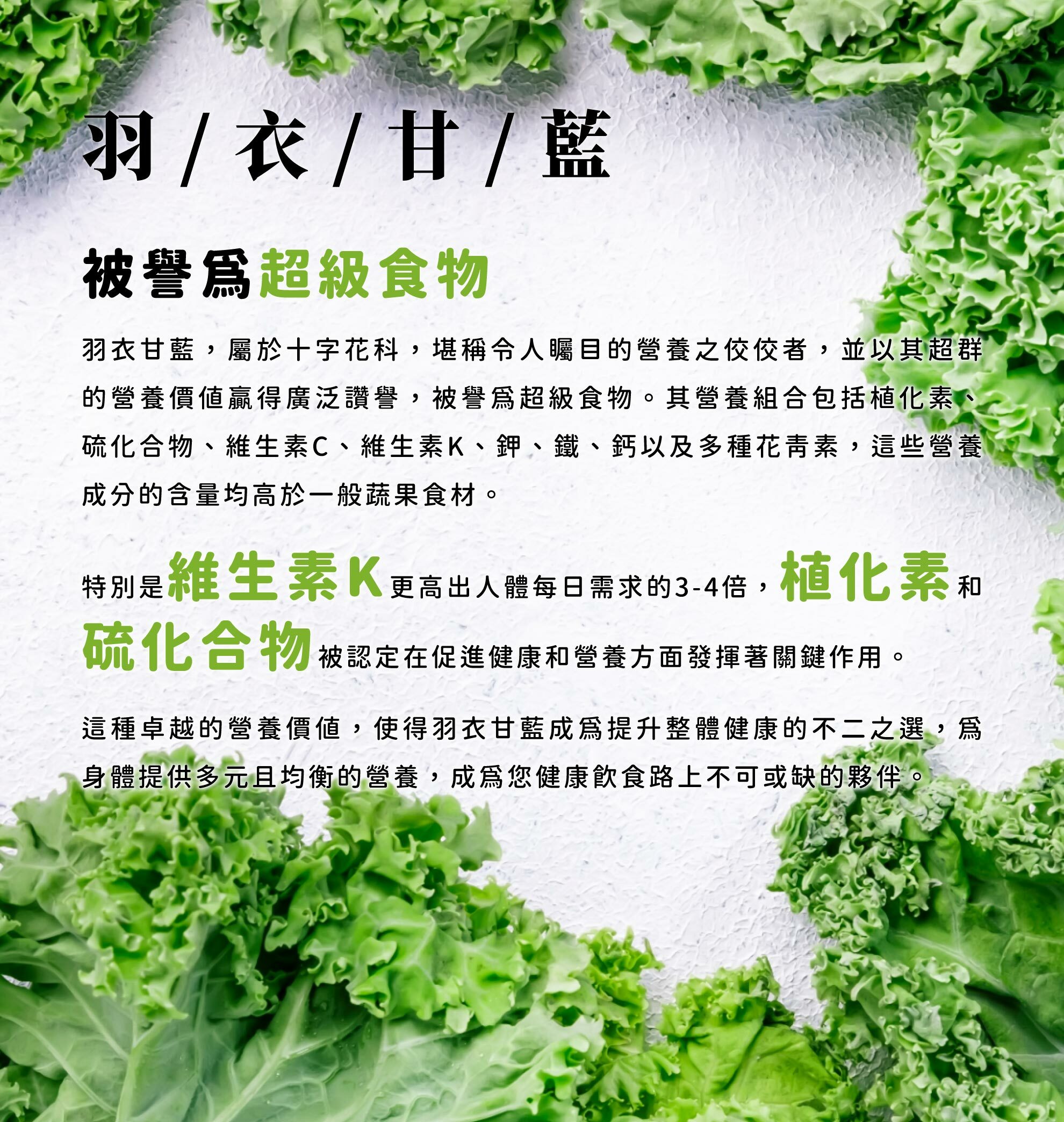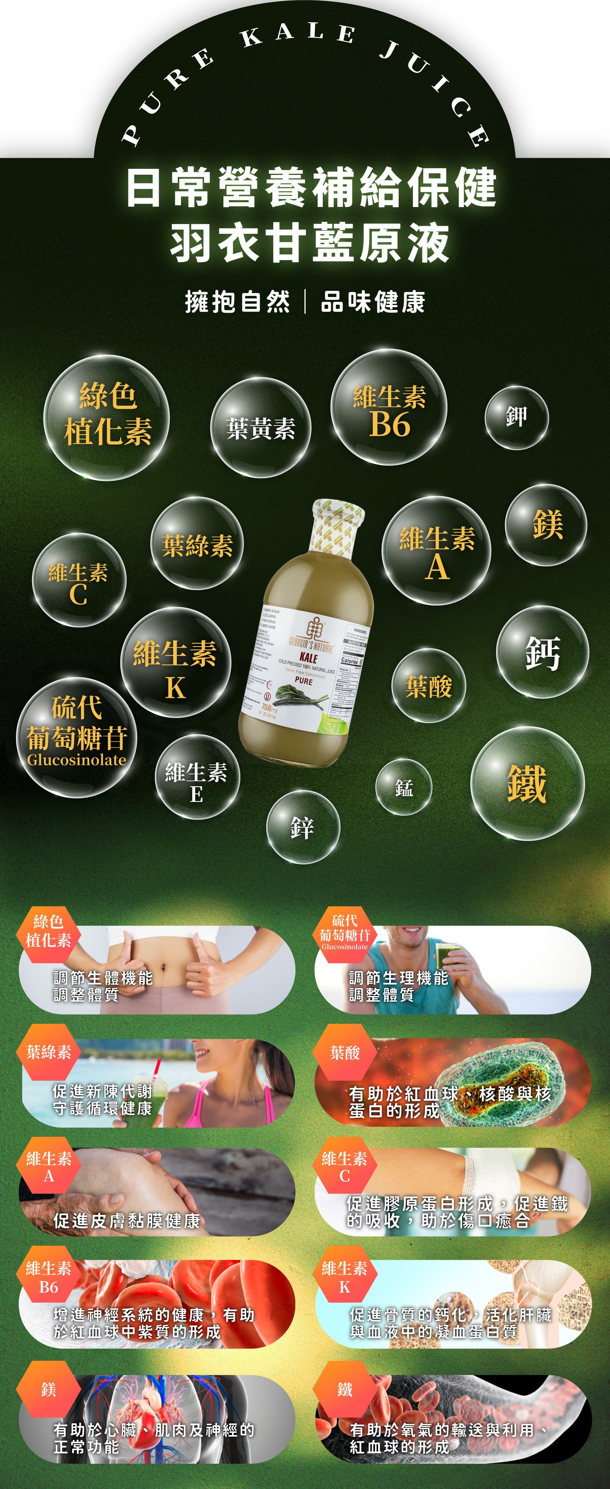 羽衣甘藍屬於十字花科蔬菜超級食物,市售少有的純羽衣甘藍汁,特有的硫化素屬高硫化蔬菜,氣味很濃郁,含有維生素K、A、鎂、鈣、葉黃素、B群的明星食材,喬治亞原裝玻璃瓶羽衣甘藍汁,一瓶含2公斤精華,選用高加索山食材冷壓鮮榨,入口清新微苦,硫化氣味較濃,建議搭配其他款式蔬果汁、水果或莓果汁混合長期飲用,樂活人生。