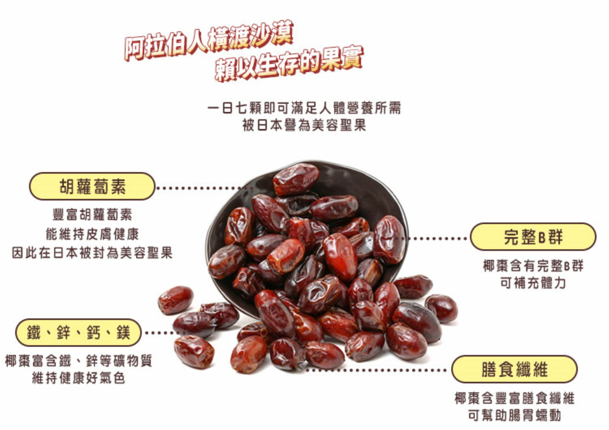 椰棗有沙漠麵包稱號,營養極高,B群、纖維、果膠、鈣、鐵、鎂、磷、胡蘿蔔素,椰棗成分主要是單醣,易消化快速吸收,1日7顆椰棗滿足一日所需。果乾中膳食纖維對於飯前食用大幅提升飽足感,有助於飲控或運動前後能量提供。