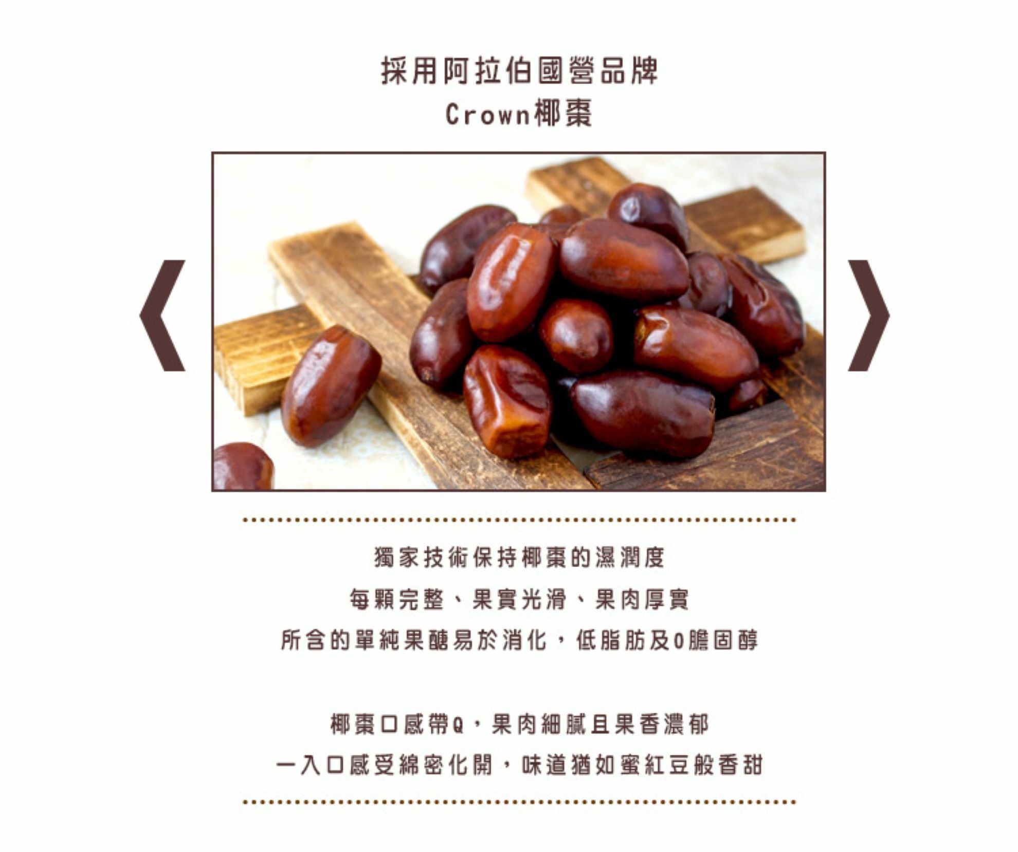 採用阿聯酋椰棗,非伊朗椰棗,無添加糖、無任何添加物,農藥殘留、大腸桿菌檢驗合格,100%純天然椰棗,經天然風乾日曬,鎖住椰棗高營養價值。