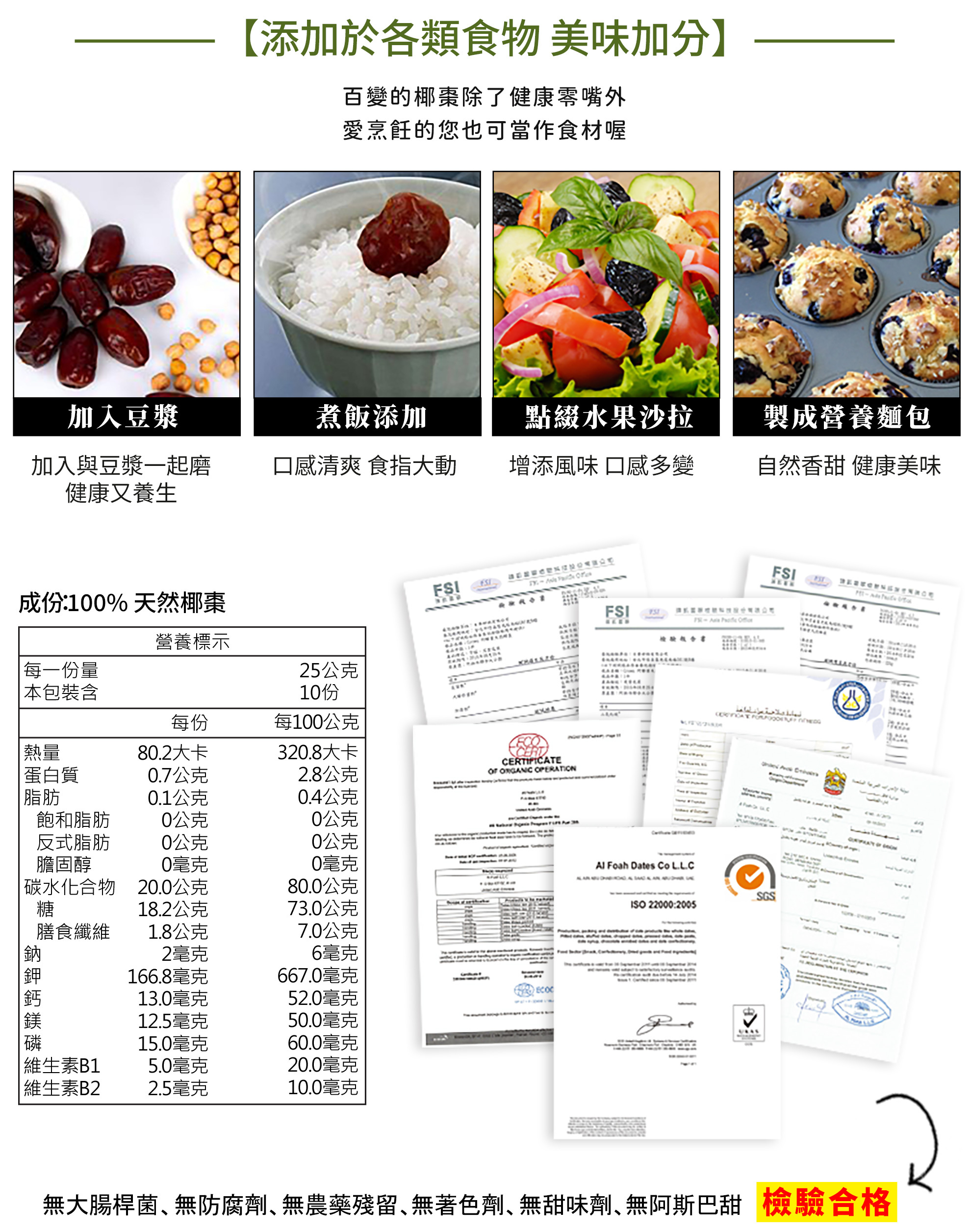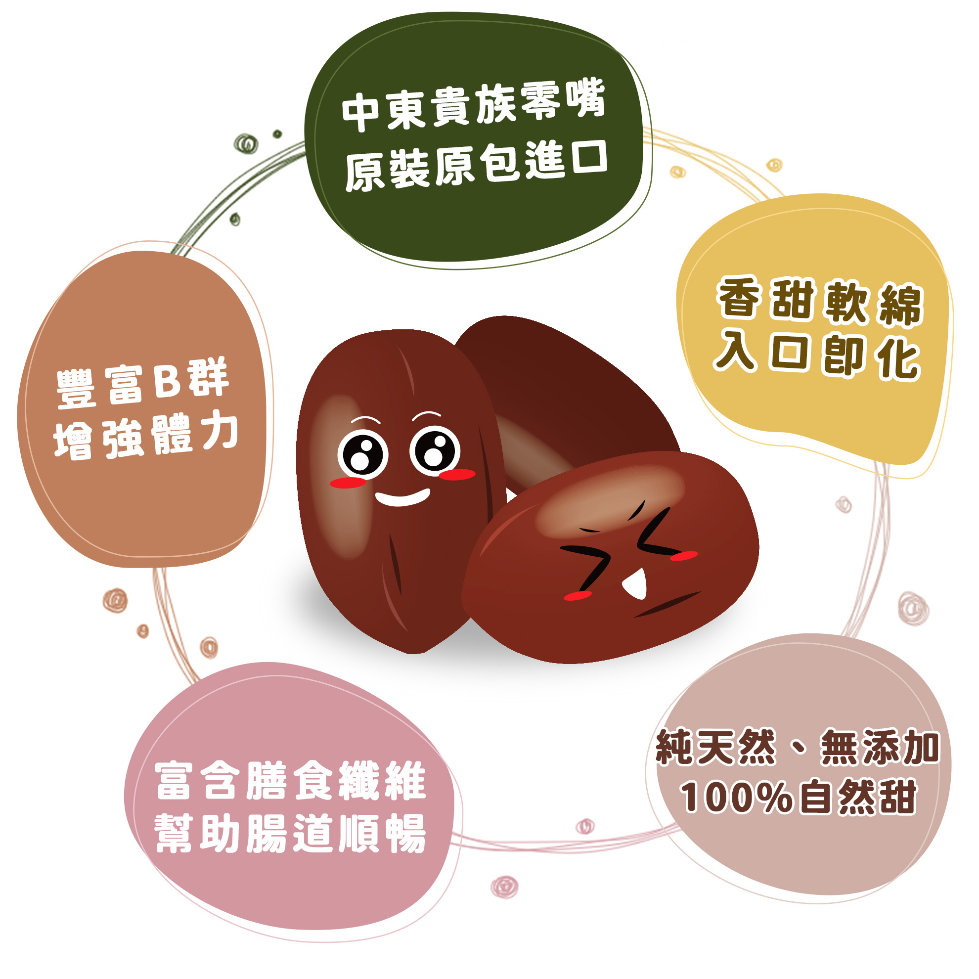 椰棗是古代阿拉伯人橫渡沙漠唯一可食用果實,有沙漠麵包稱號,椰棗營養極高,B群、纖維、果膠、鈣、鐵、鎂、磷、胡蘿蔔素,椰棗成分主要為單醣,易吸收消化,日本也將椰棗納入美容寶庫的聖品,國際農糧組織也將椰棗納入為糧食之一,1日7顆椰棗滿足一日所需。
