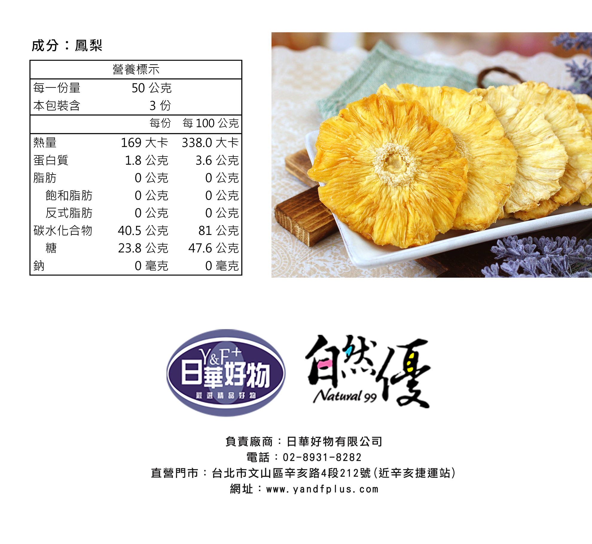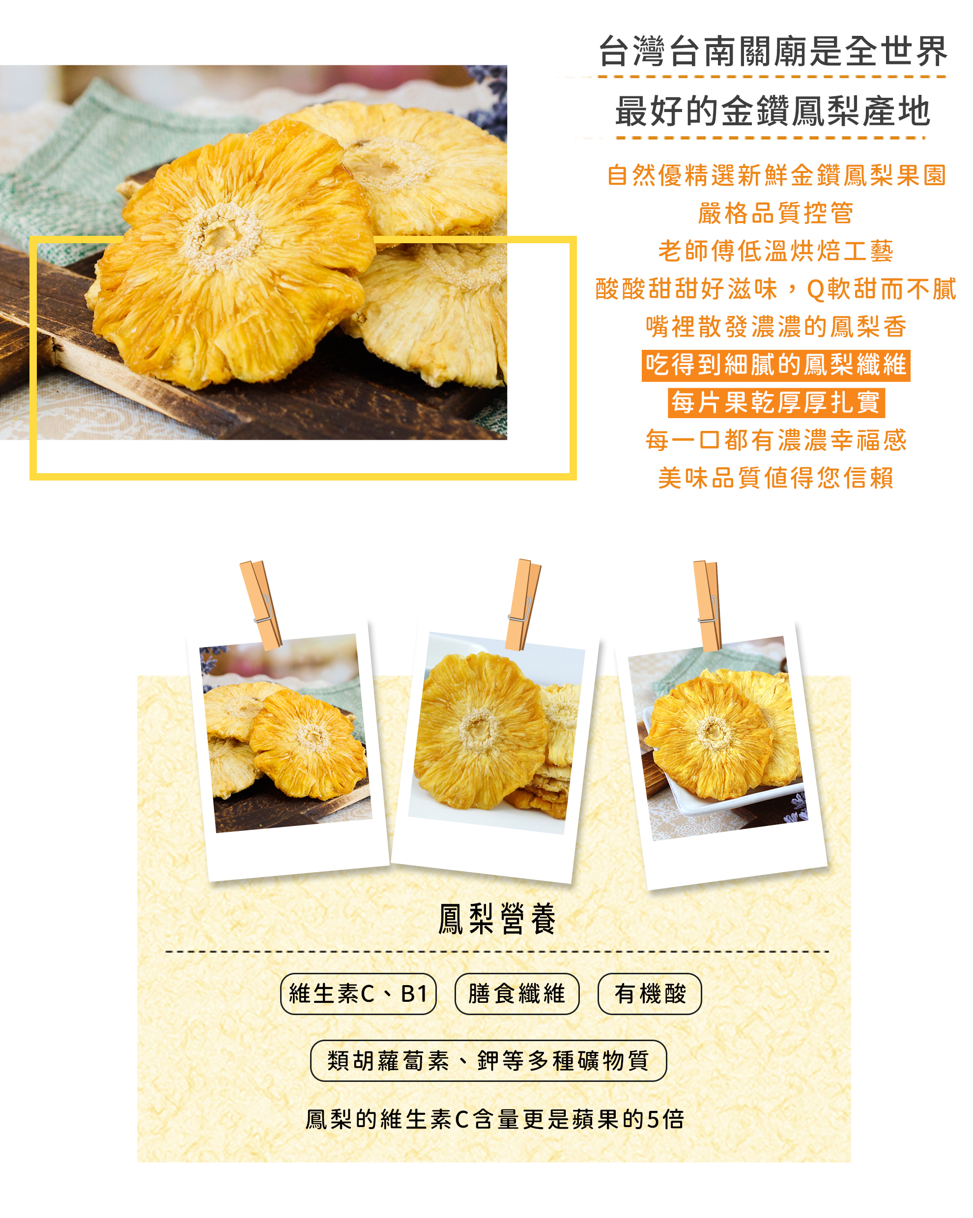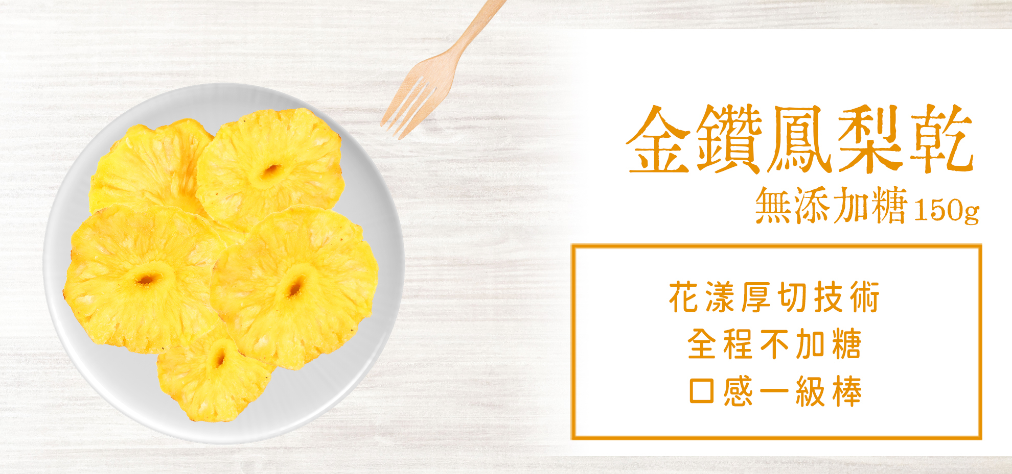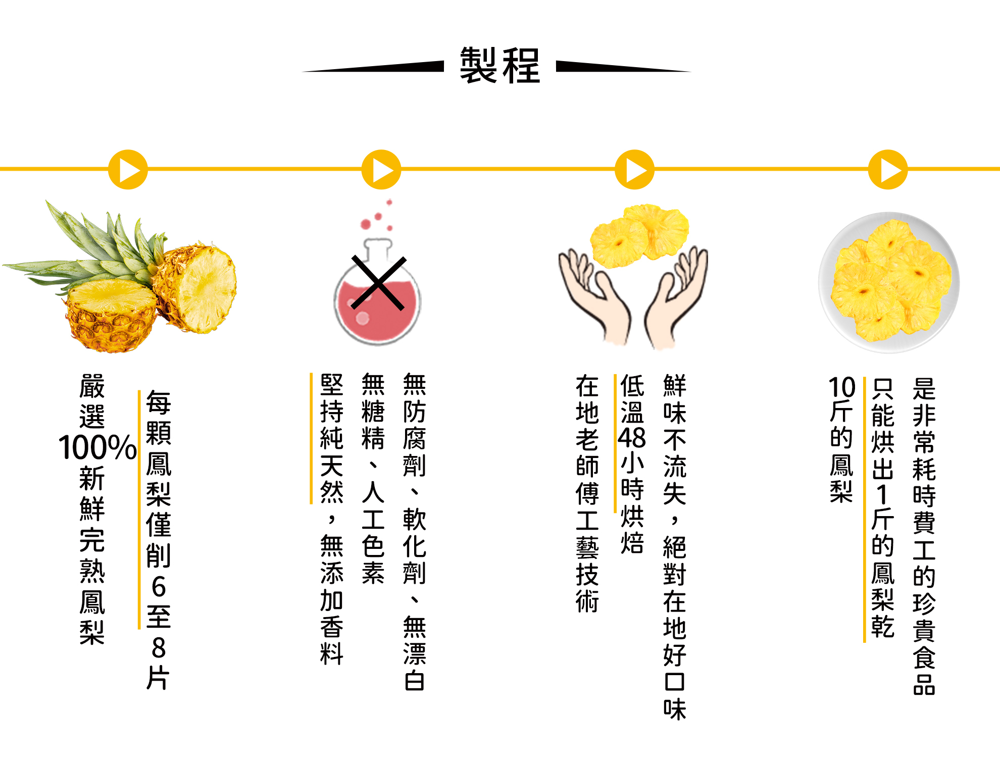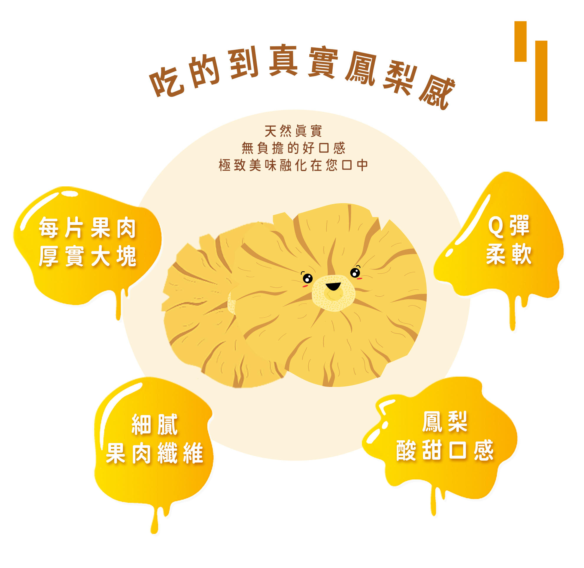 採用台農17號在欉紅自然熟成金鑽鳳梨,鳳梨厚切成太陽花形狀,每顆僅切成6-8片,經過48小時低溫烘焙,香氣撲鼻,過程無加糖或糖漬,保留鳳梨酵素、維生素C與果肉營養,超大片無加糖鳳梨乾,口感濕潤Q軟,酸甜滋味,吃得到細膩鳳梨纖維。如果你是喜歡吃鳳梨乾的人,會感受到無加糖鳳梨乾跟糖漬鳳梨乾的不同。