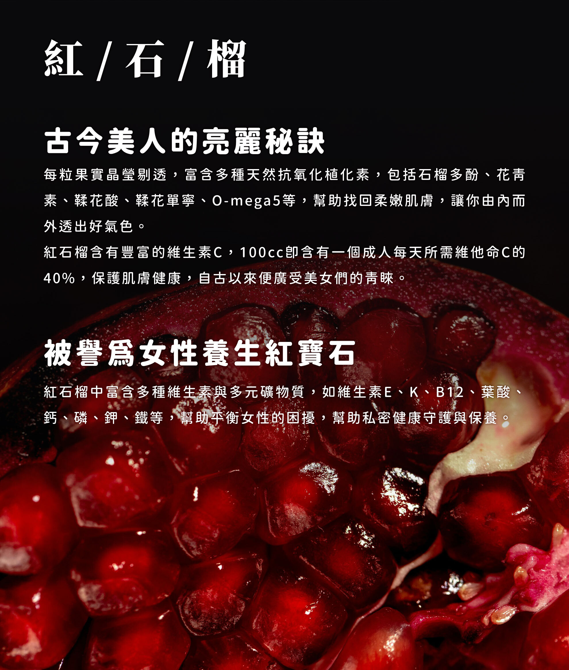 紅石榴中天然鞣花酸、單寧酸、鐵、維生素C、維生素E,蘊含多元營養素,平日飲用紅石榴汁營養補給,養顏美容、青春美麗。
