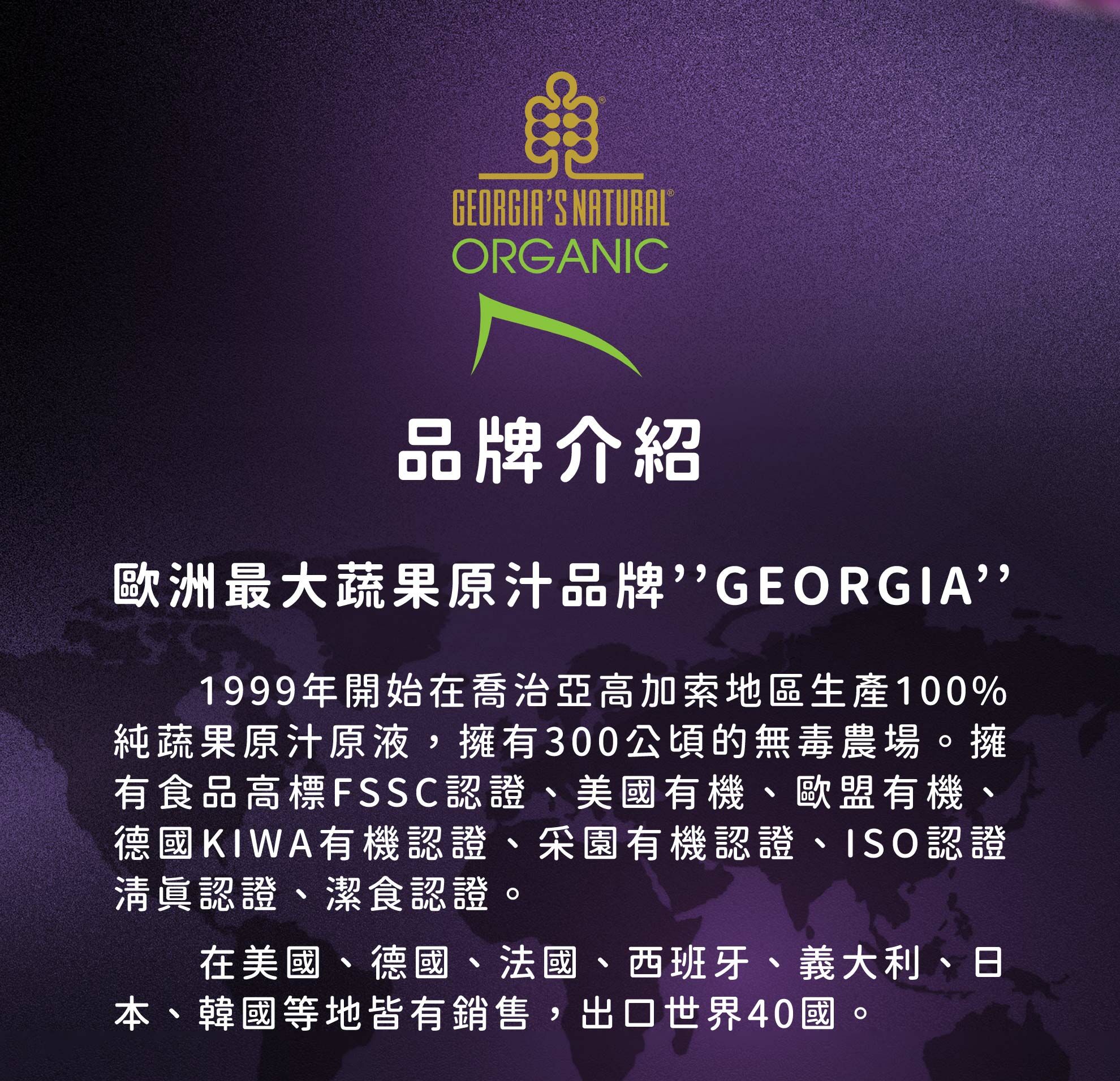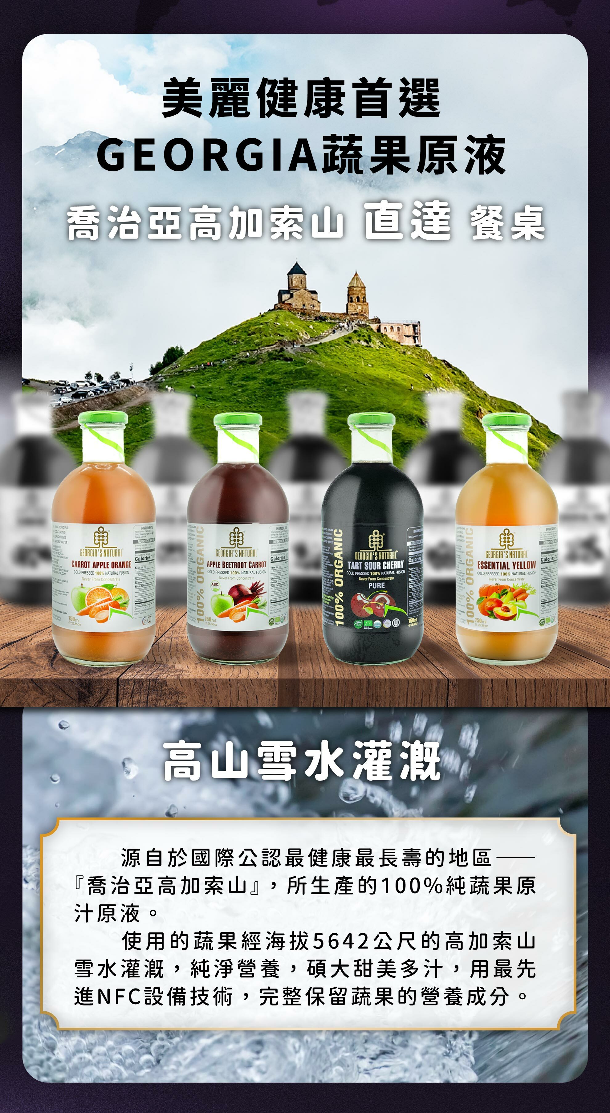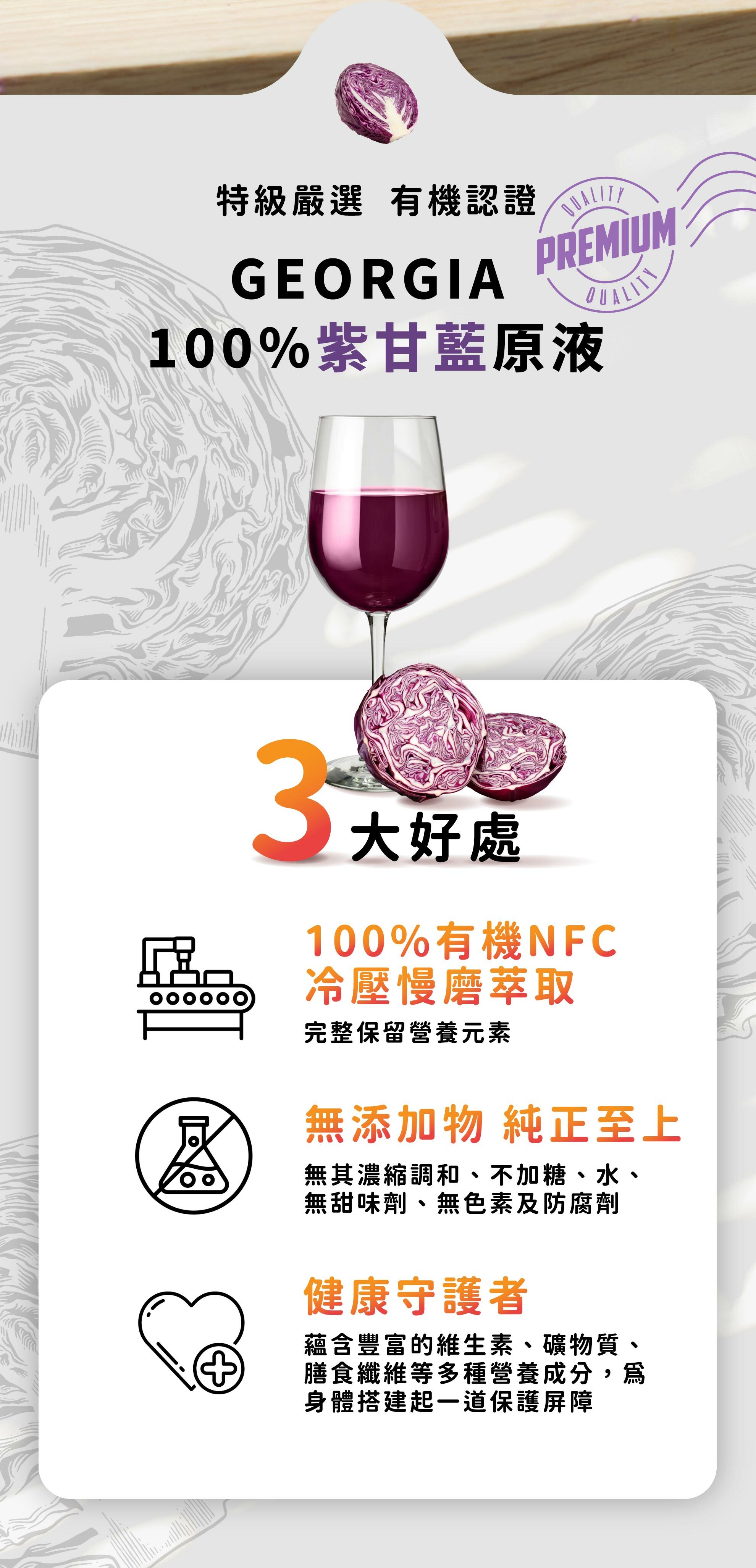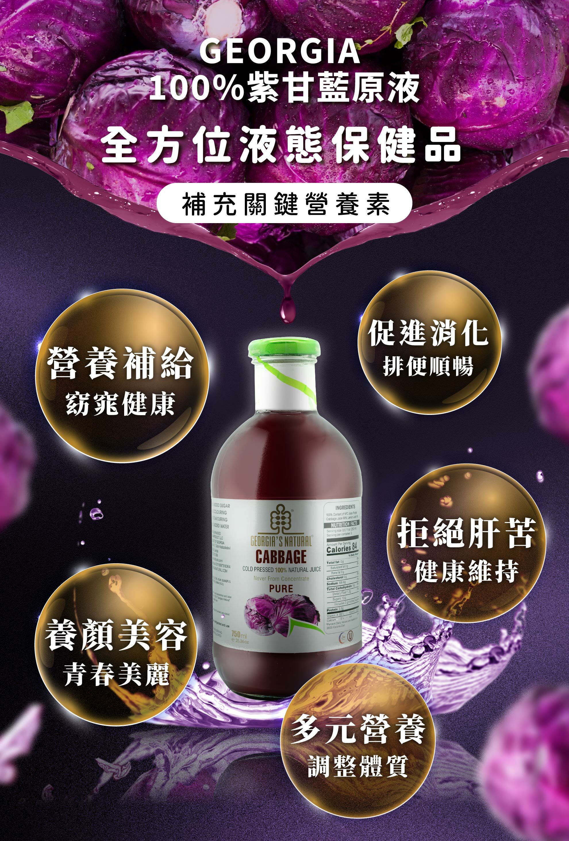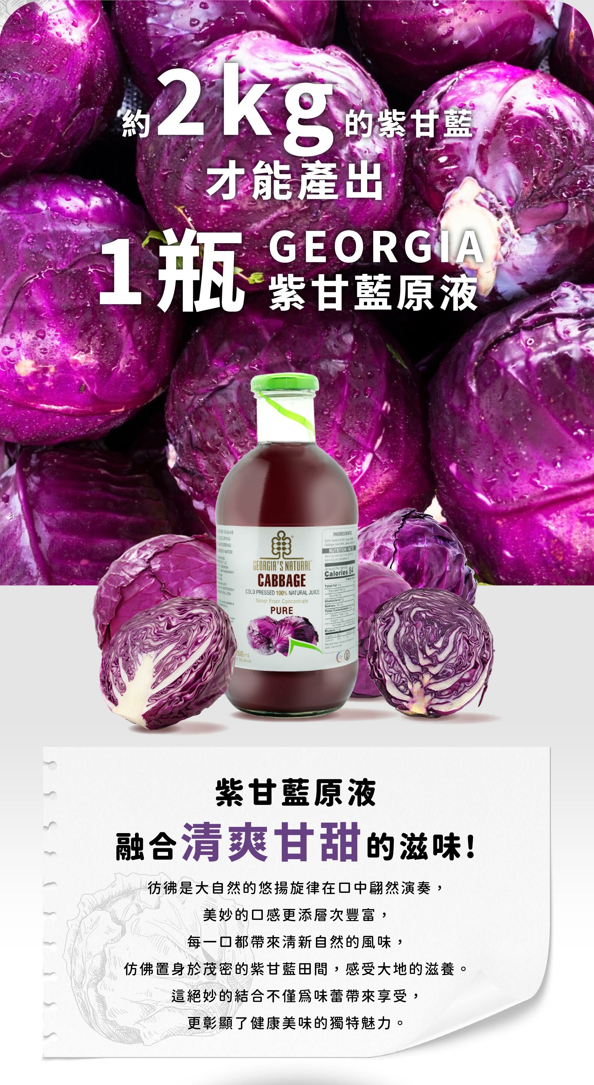 喬治亞原裝玻璃瓶紫甘藍汁,是市面極少見的蔬菜汁,紫甘藍一瓶含2公斤精華,選用高加索山有機食材冷壓鮮榨,十字花科特有植化素蘿蔔硫素,紫甘藍屬高硫化蔬菜,且多了天然紫色的花青素,入口美妙清新口感,長期飲用有助健康維持。