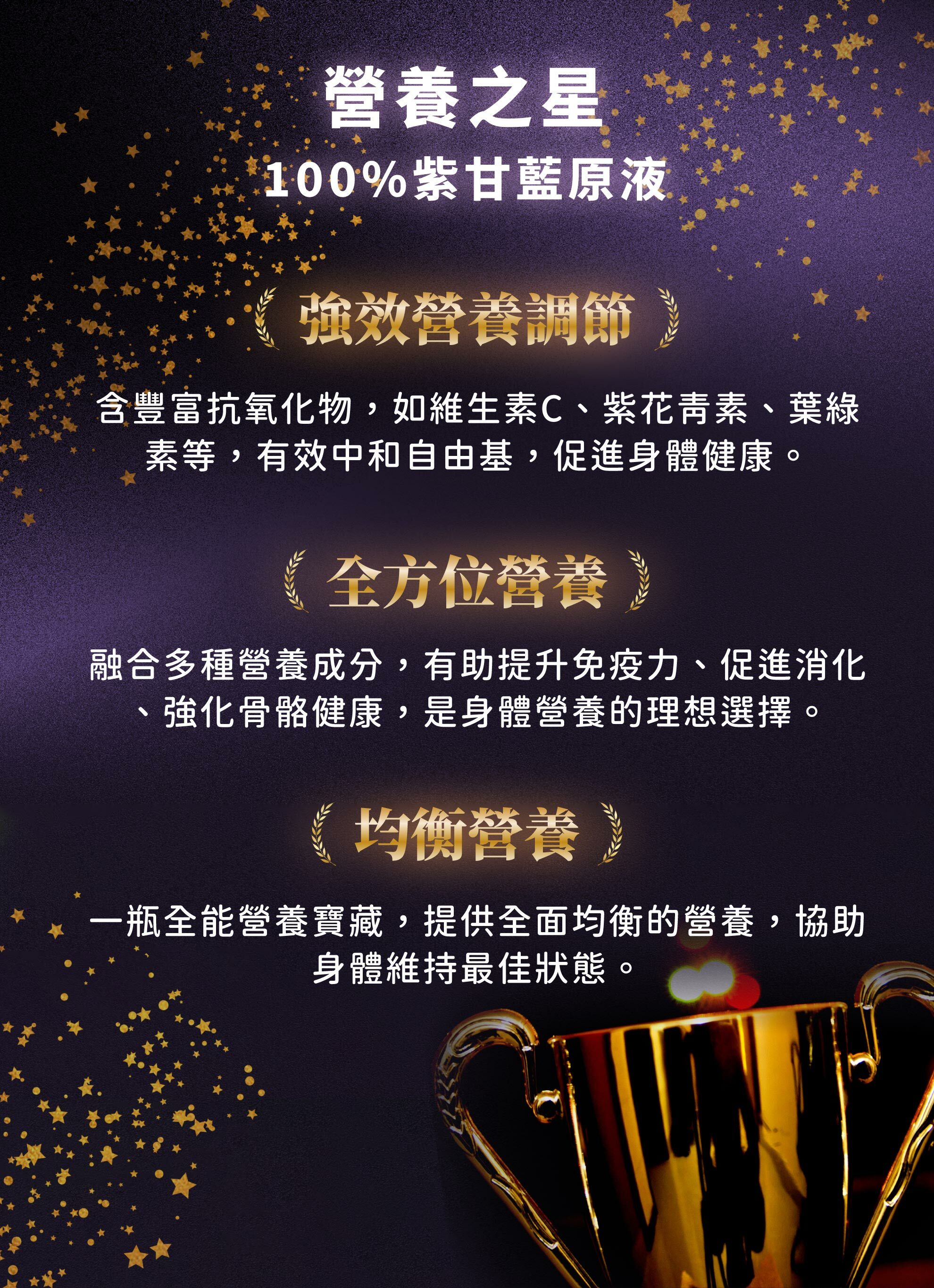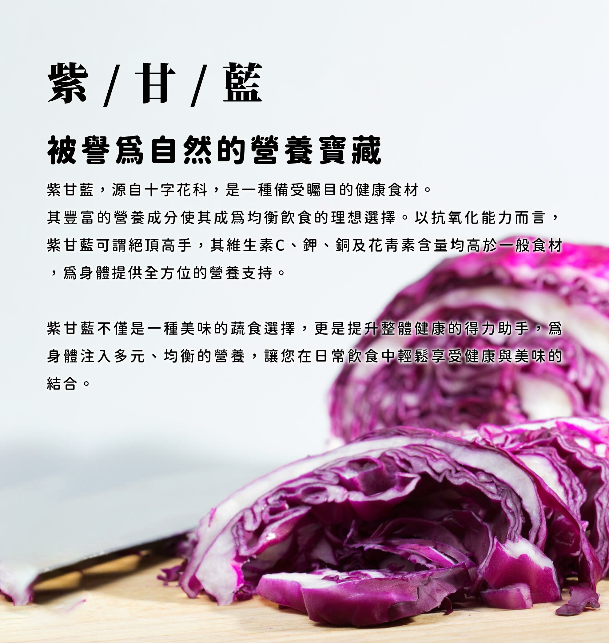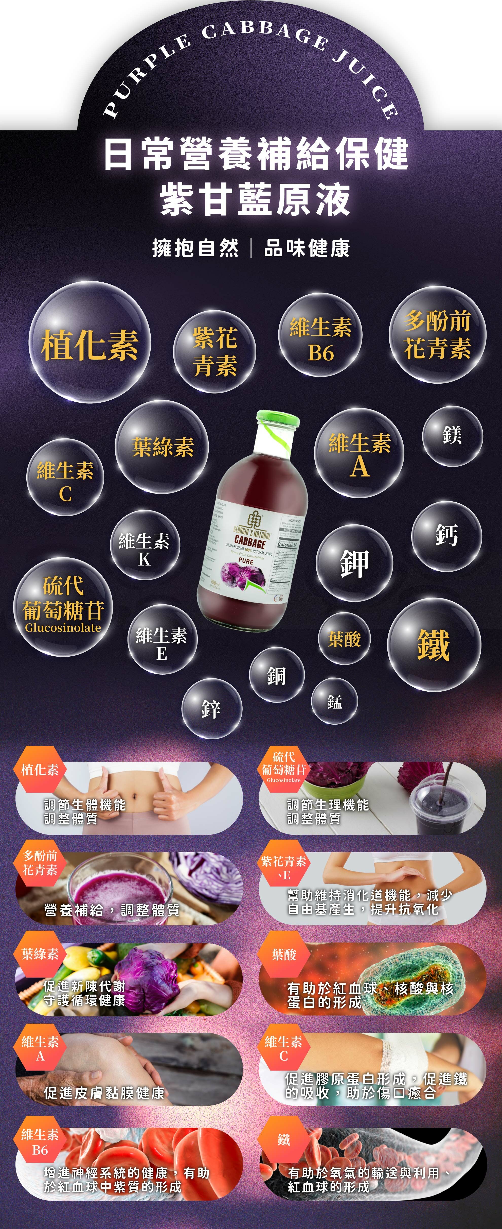 無加糖、無加水、非濃縮果汁,蔬果含量100%純紫甘藍原汁,每日補充100毫升補足蔬菜營養,也可與綜合蔬果汁或是水果汁混合飲用,或是搭配執行輕斷食首選,每天飲用多元蔬果植化營養素,液態吸收快,每日蔬果養生保健,調整體質、生理機能,全家都能飲用。