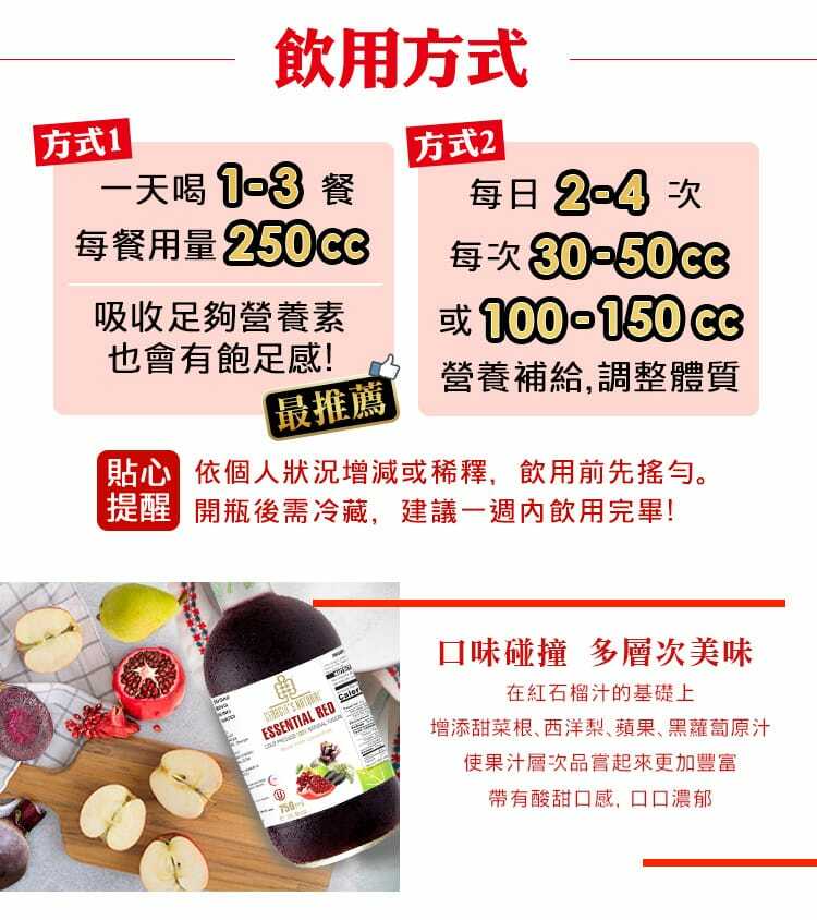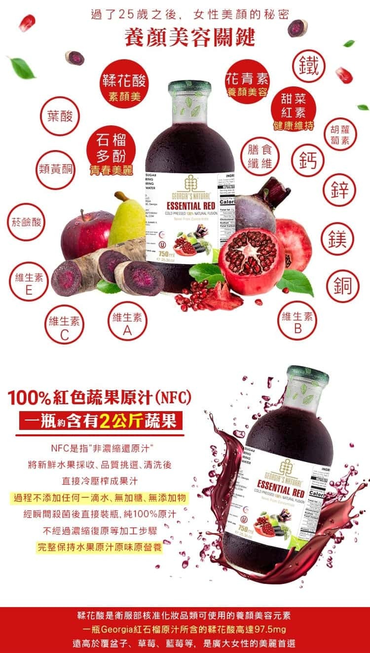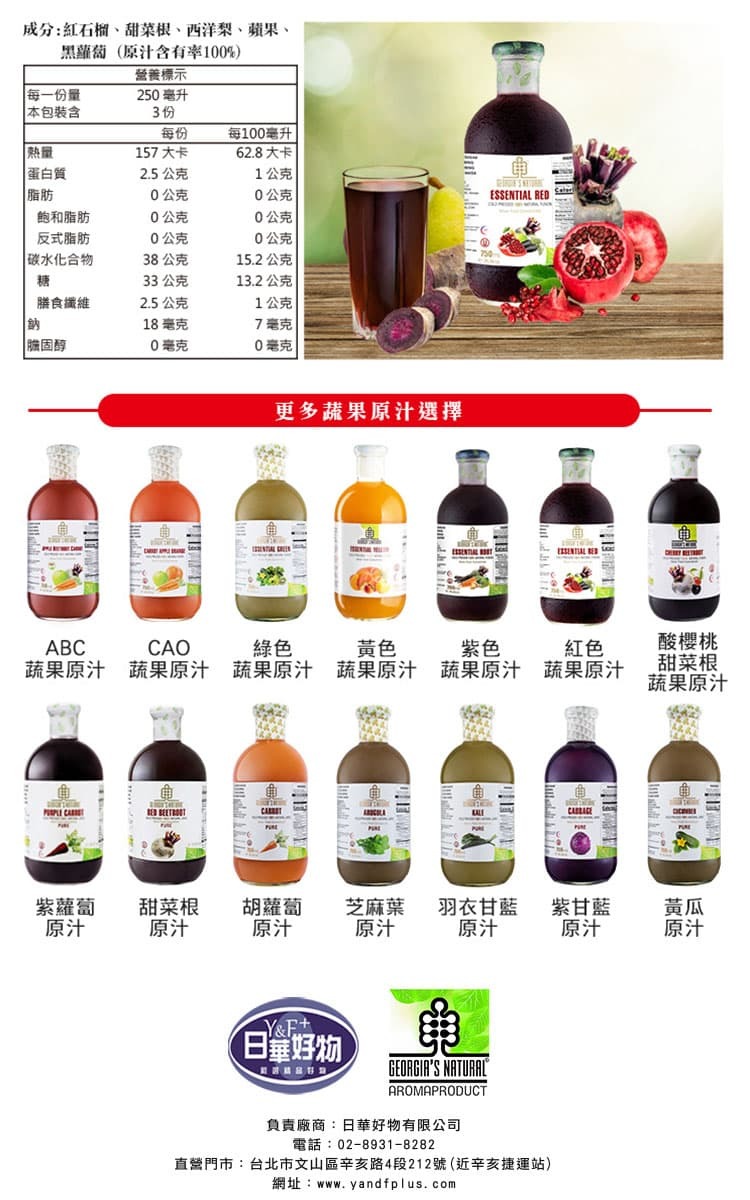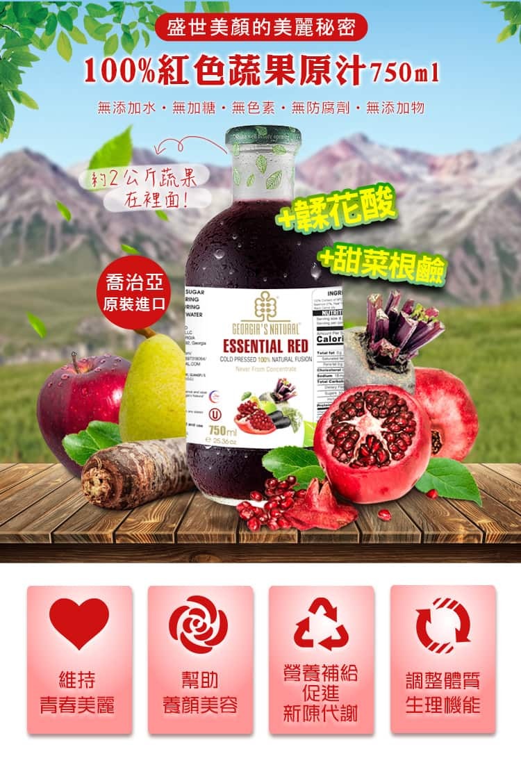 喬治亞原裝玻璃瓶冷壓綜合蔬果汁,紅色蔬果汁一瓶含有2公斤蔬果精華,配方使用紅石榴、甜菜根、西洋梨、青蘋果、黑蘿蔔,選用高海拔高加索山有機食材新鮮榨汁,無加糖、無加水,不經過濃縮及還原加工,蔬果含量100%純原汁,每日補充100毫升補足蔬果營養。