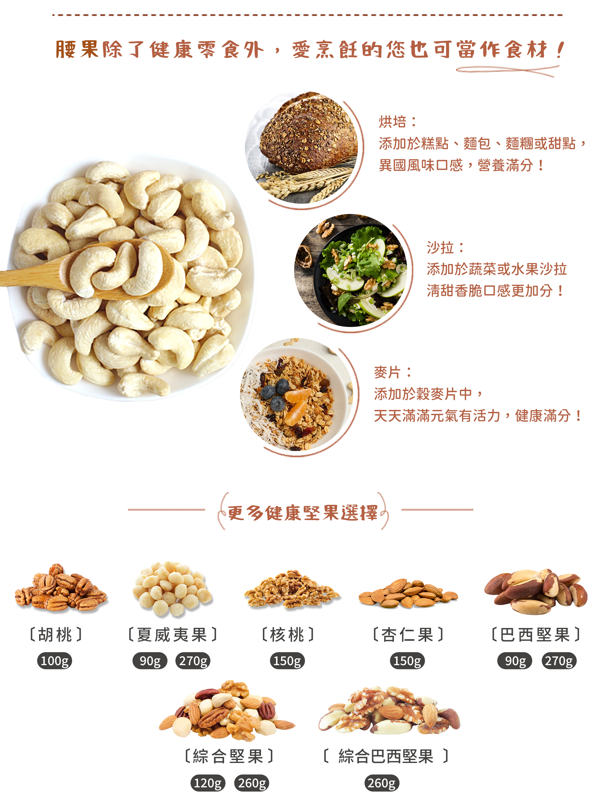 腰果是堅果中熱量最低的堅果,對於飲控是很好的零食,多元營養素,豐富蛋白質、omega3、維生素E、鈣質、胺基酸、鎂、鋅,均衡衛福部建議每日一把堅果,腰果會是您解饞或是健身後營養補充的堅果首選。