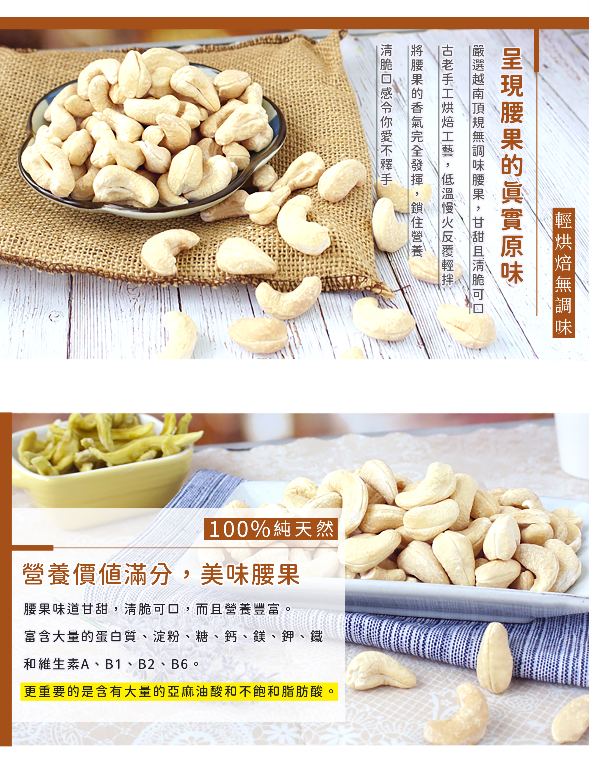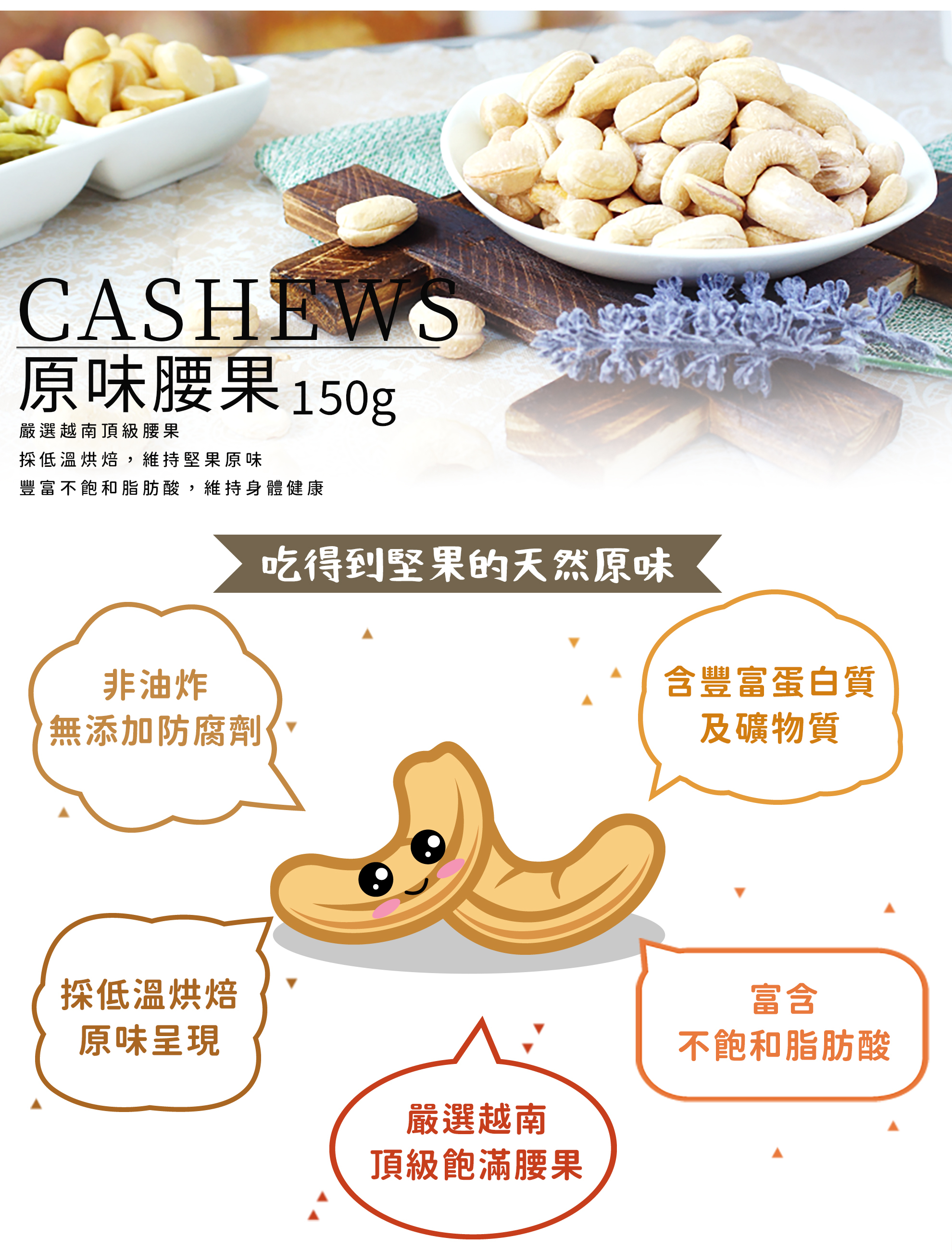 獨特熱帶雨林產地造就越南特大腰果,選用WW180優質果仁規格,比市售腰果大1.5倍,耗時低溫烘焙將果仁釋放自然香氣,無調味配方,無任何添加,兼具美味營養,酥脆爽口,扎實飽滿,香氣濃郁,是女性最愛的堅果之一。