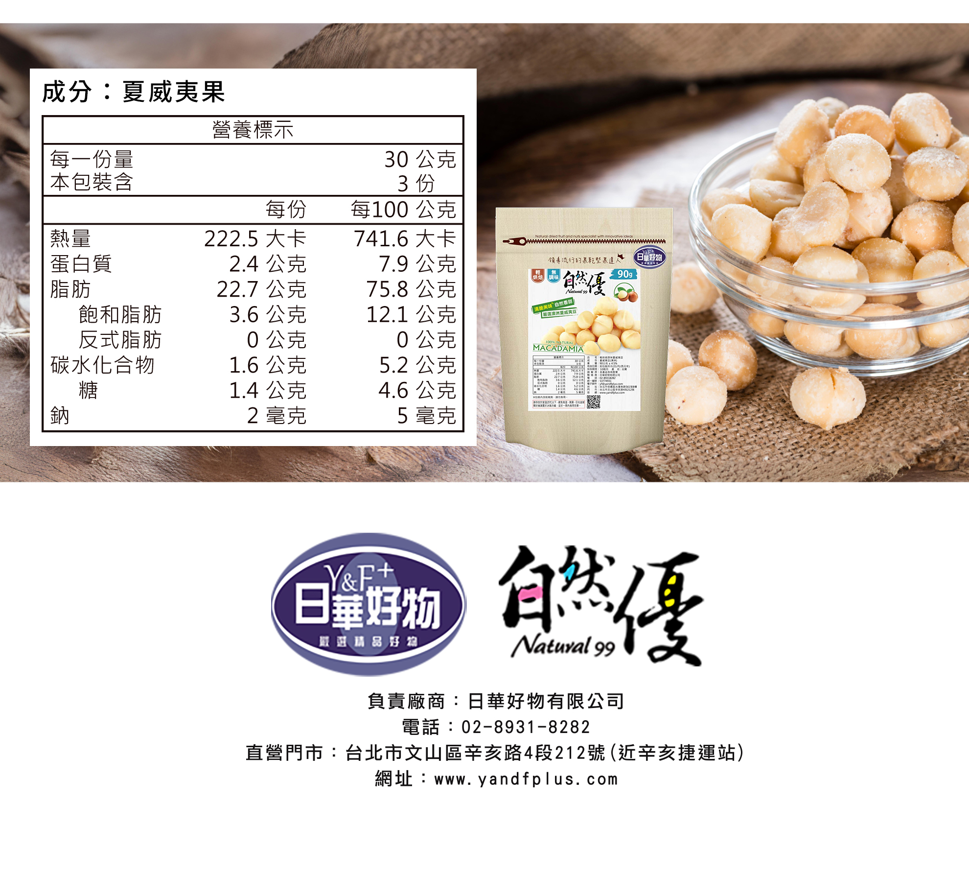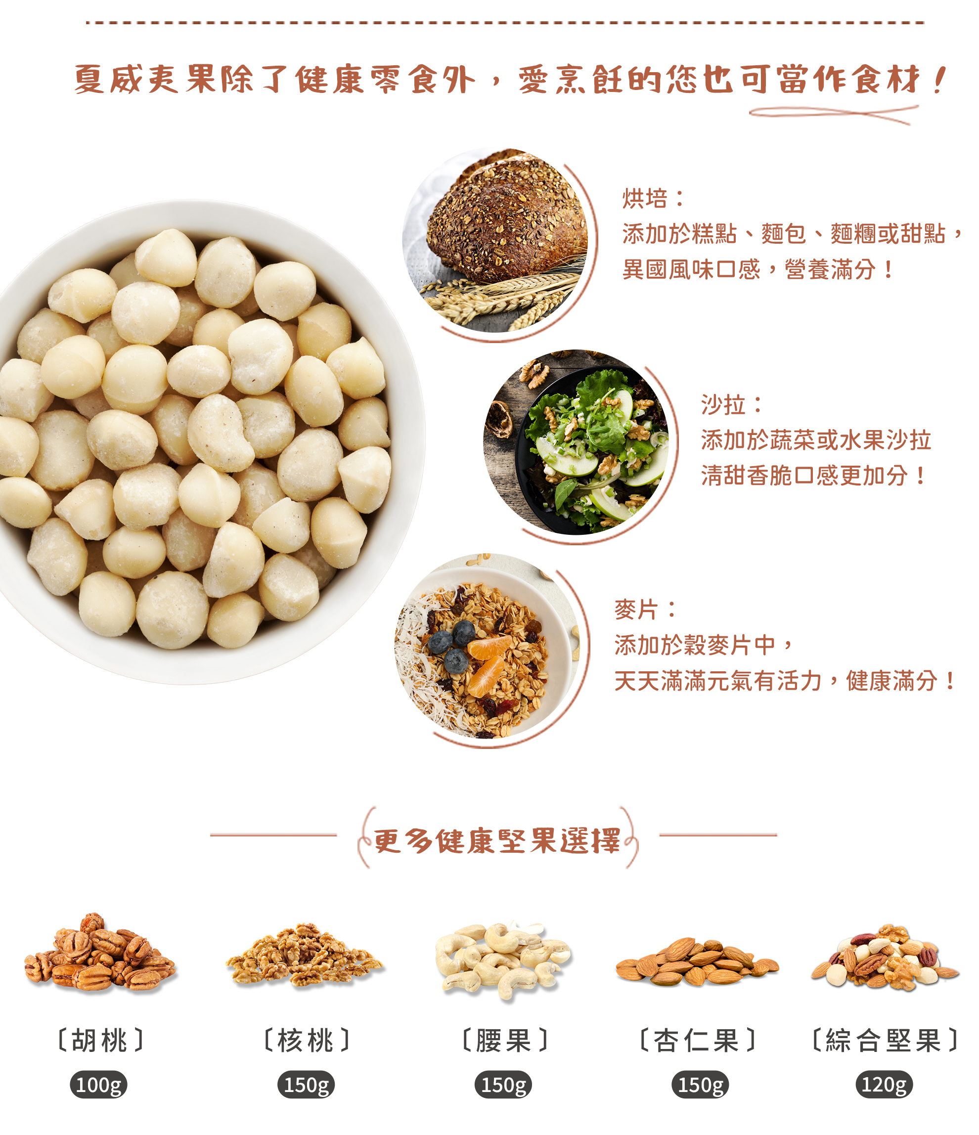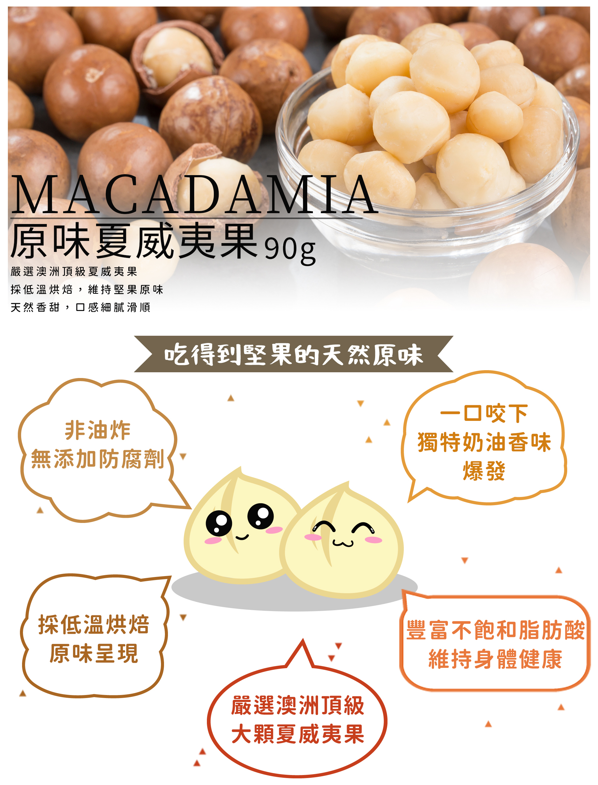 夏威夷豆天然不飽和脂肪酸高居堅果之冠,多元營養素,豐富蛋白質、omega3、維生素、鈣質、胺基酸、鎂、鋅,均衡衛福部建議每日一把堅果,自然優夏威夷豆是您的網購堅果首選。