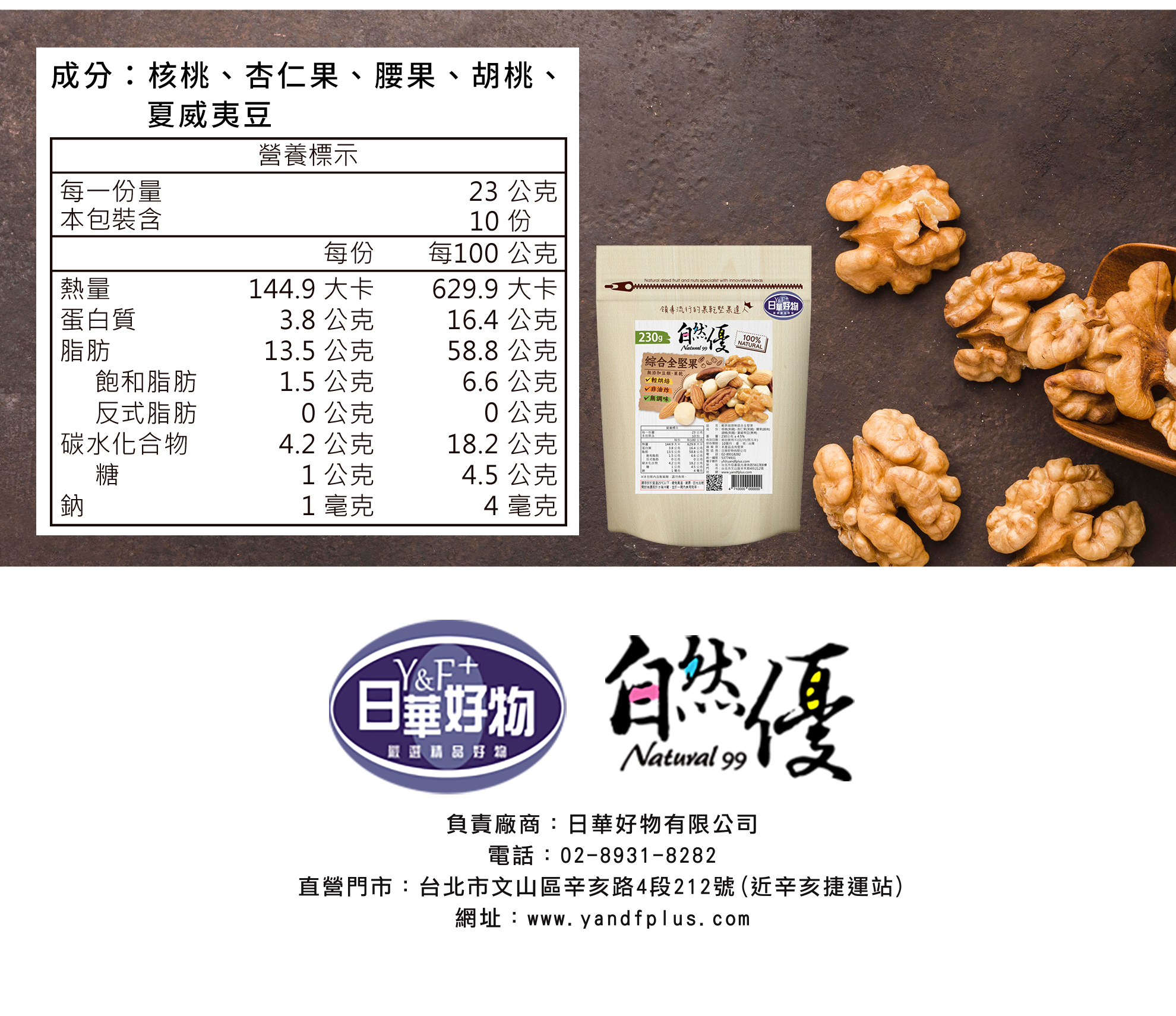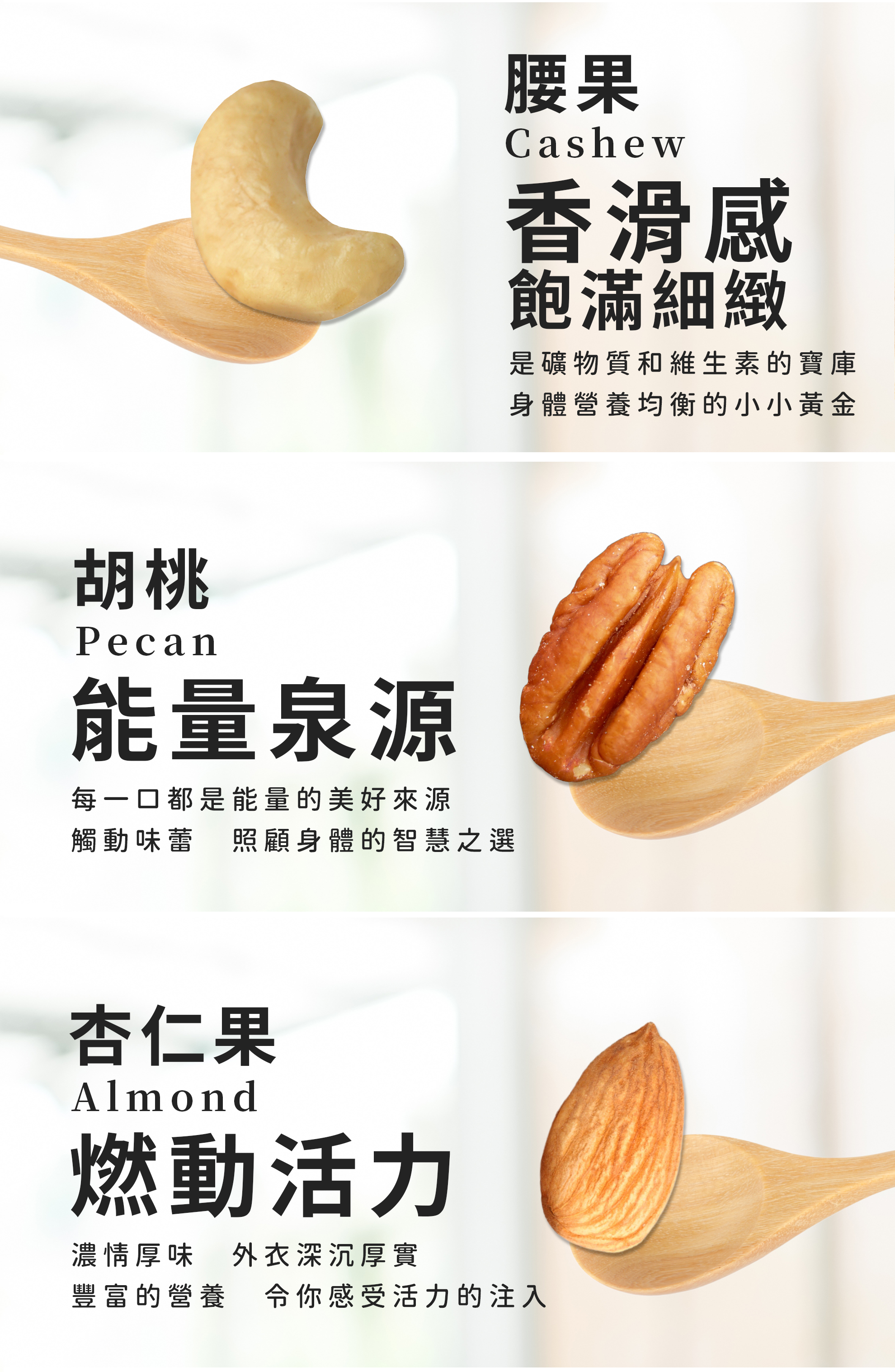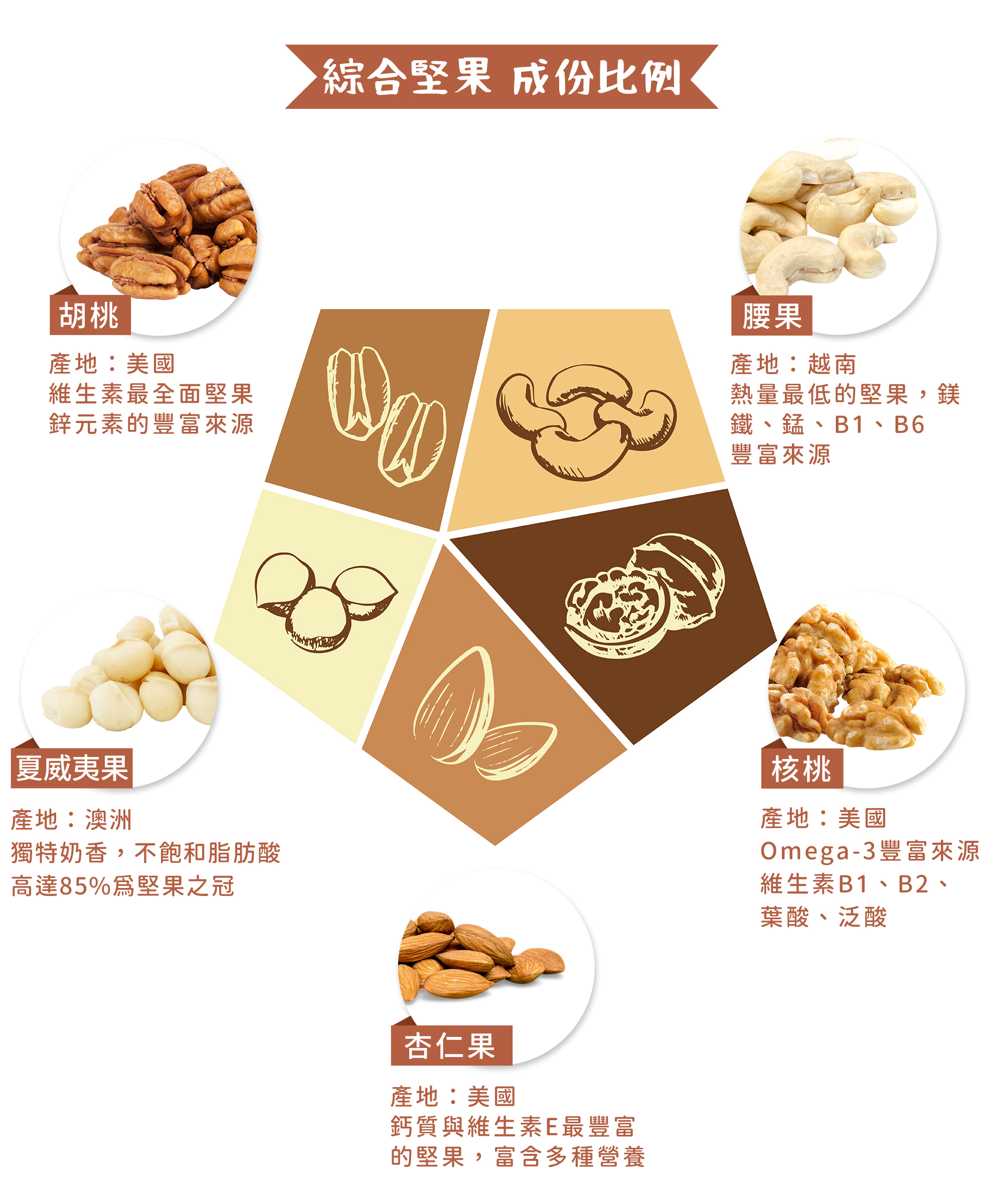 嚴選美國、澳洲、越南頂級堅果產地,營養師調配黃金營養比例5種綜合堅果混合,含腰果、核桃、杏仁果、夏威夷豆、胡桃,精選大顆完整飽滿果仁,比市售果仁大1.5倍。