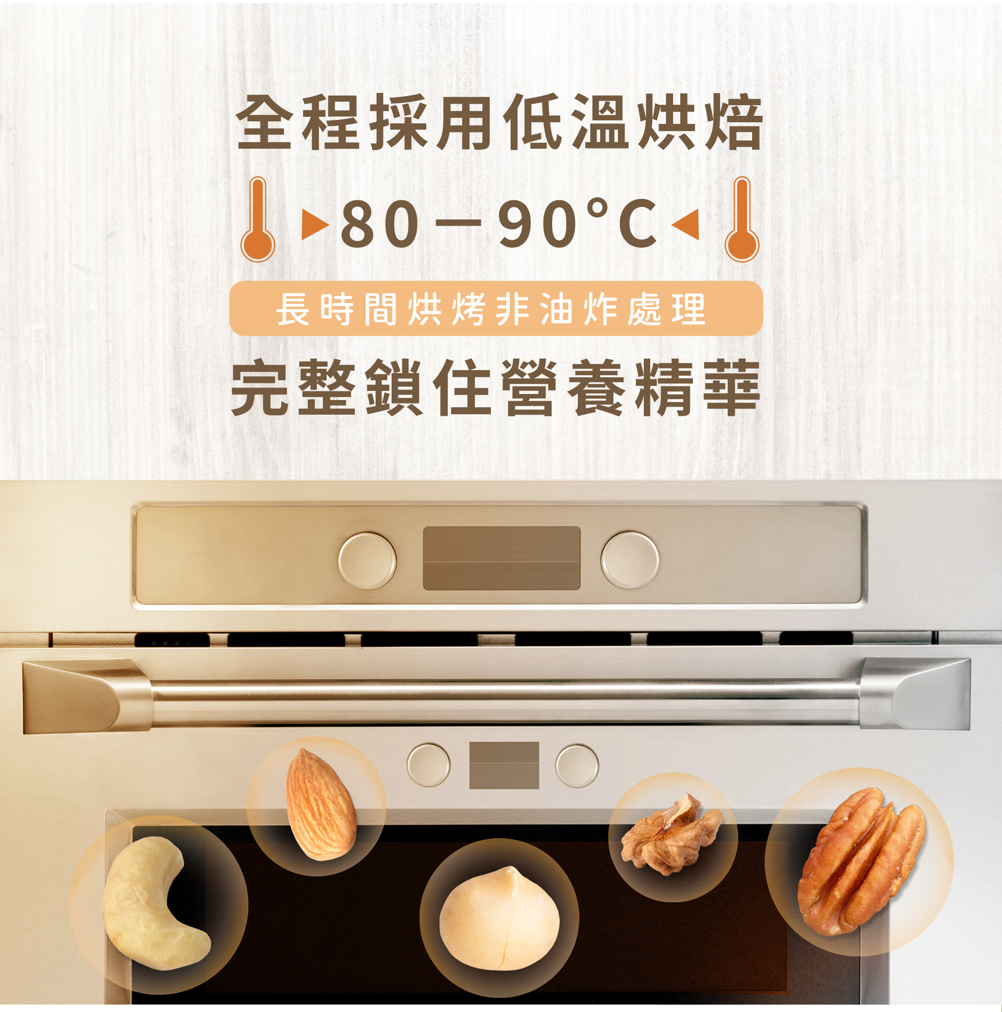 每種堅果根據油脂與水活性分批烘焙,經過耗時低溫烘焙釋放果仁原始香氣,無調味配方,無任何添加,新鮮堅果吃得到果仁清甜,兼具美味營養,酥脆爽口,是網購堅果首選。