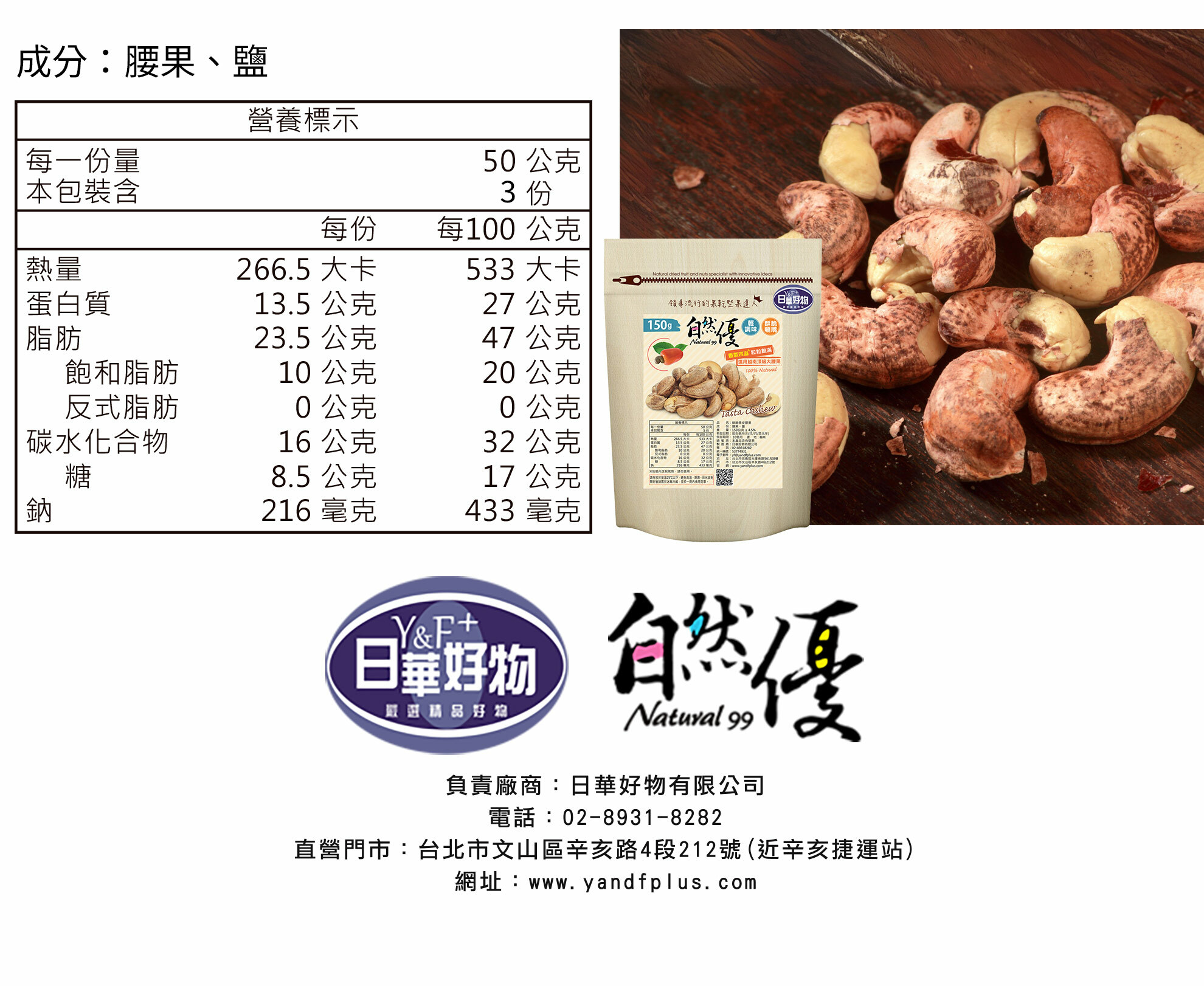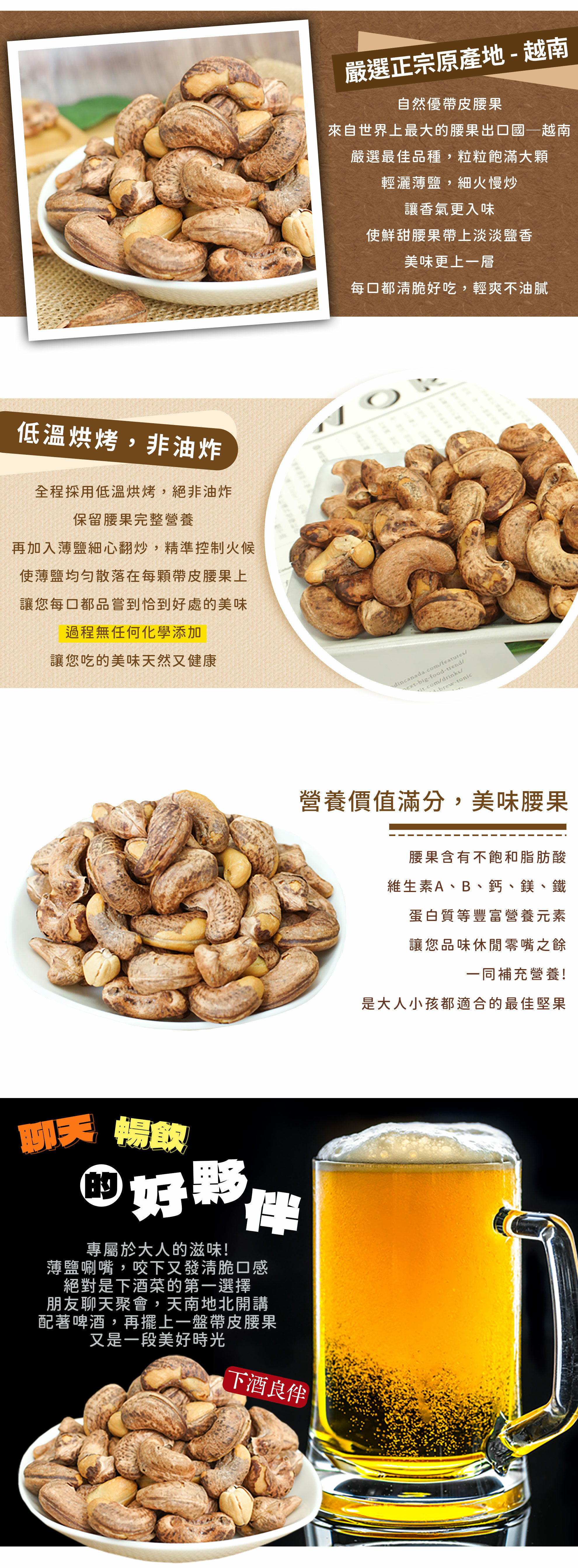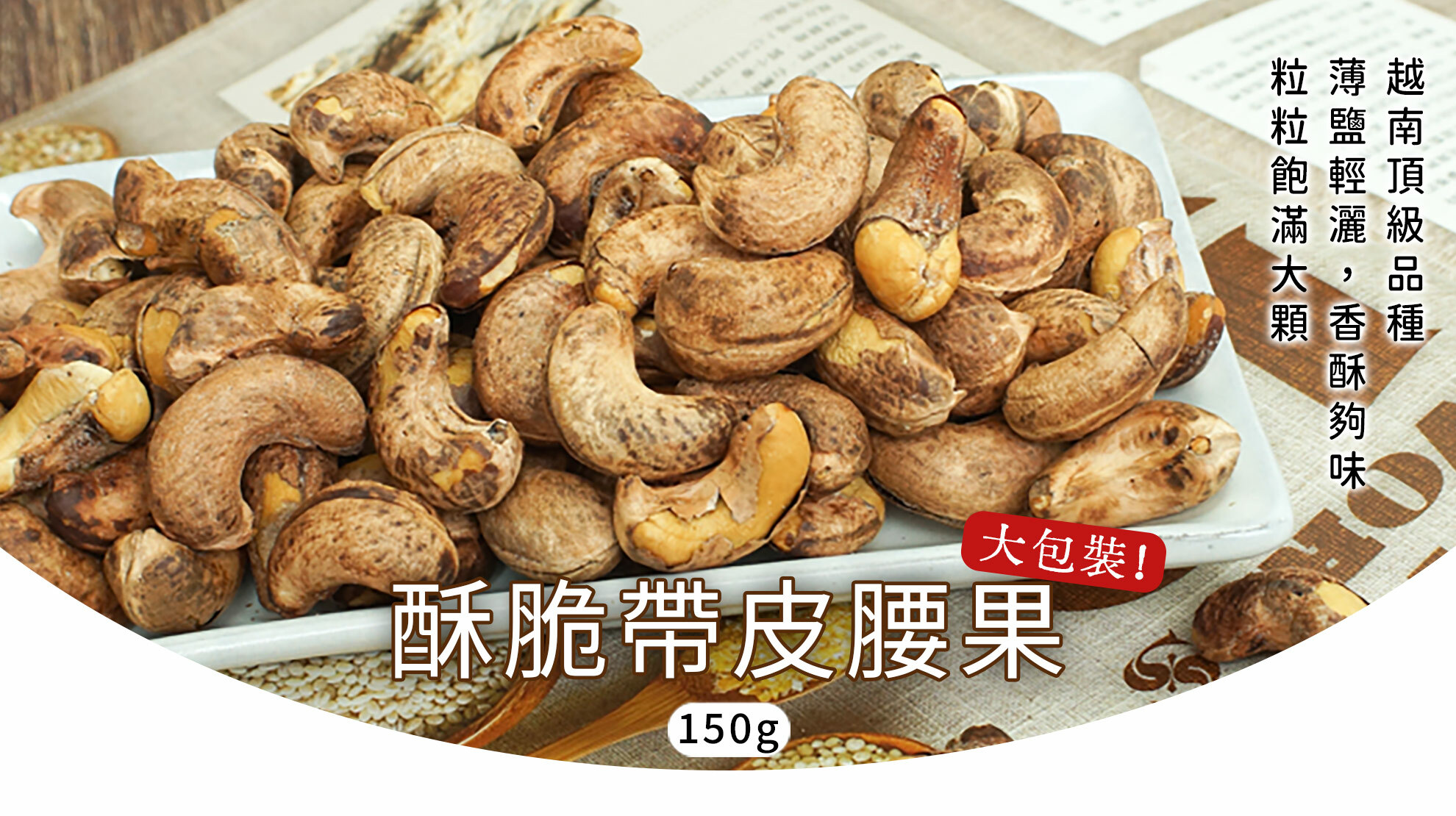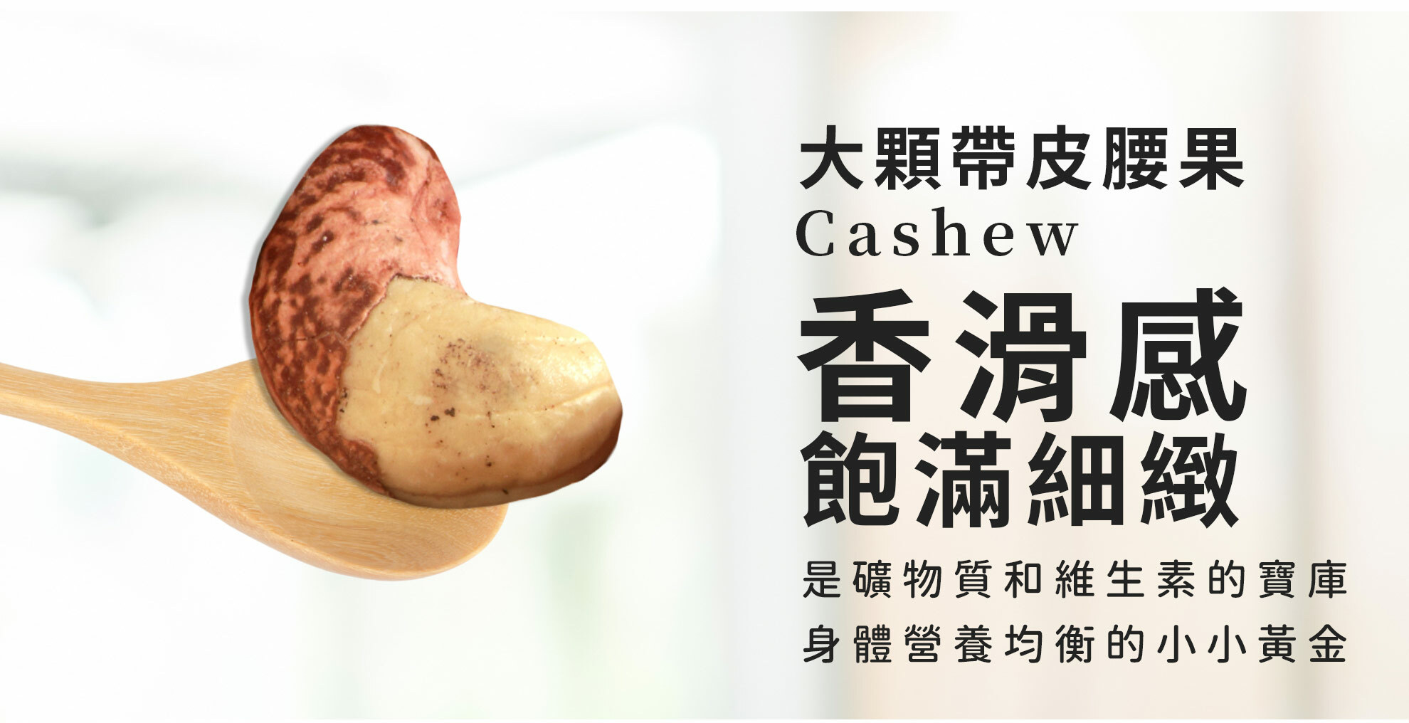 使用越南飽滿WW240大顆帶皮腰果,腰果富含蛋白質、胺基酸、亞麻油酸好油,帶皮腰果的外膜含有更豐富的維生素E營養價值,烘焙後以少鹽反覆拌炒,將果仁釋放鹹香,香脆好吃,外脆內香,風味具濃厚。