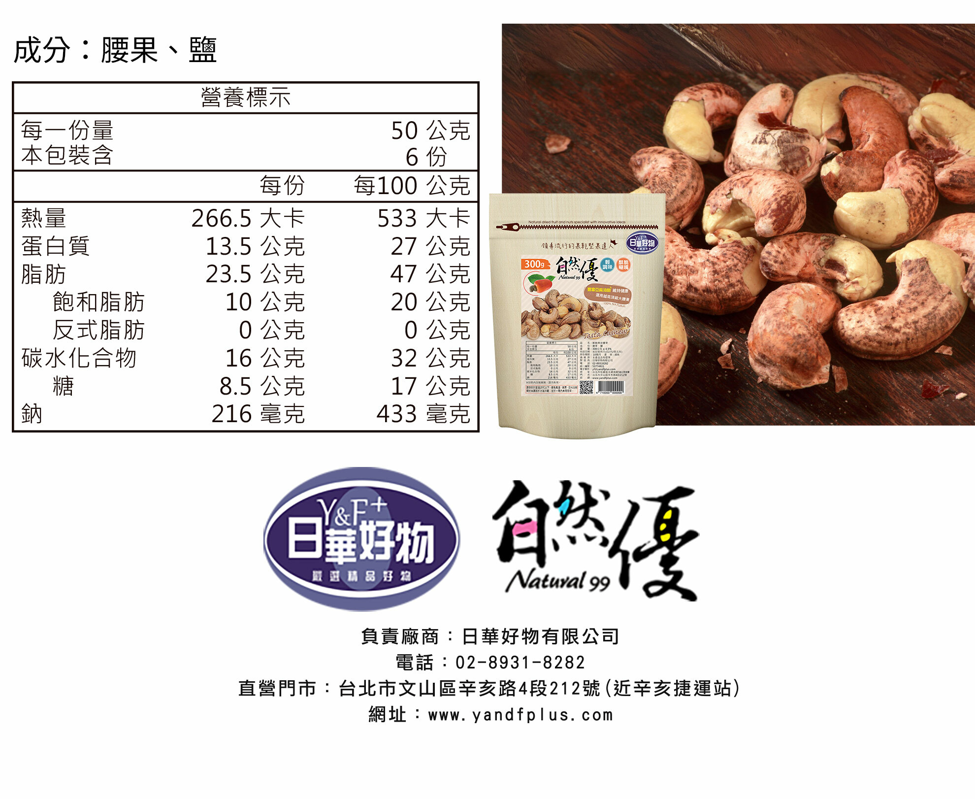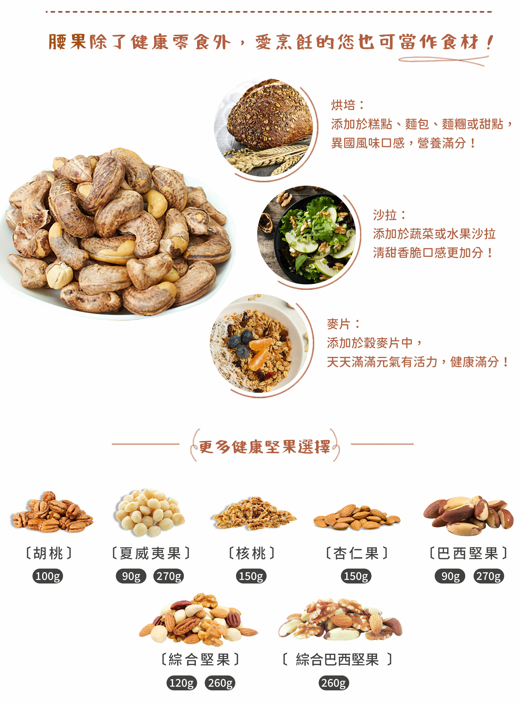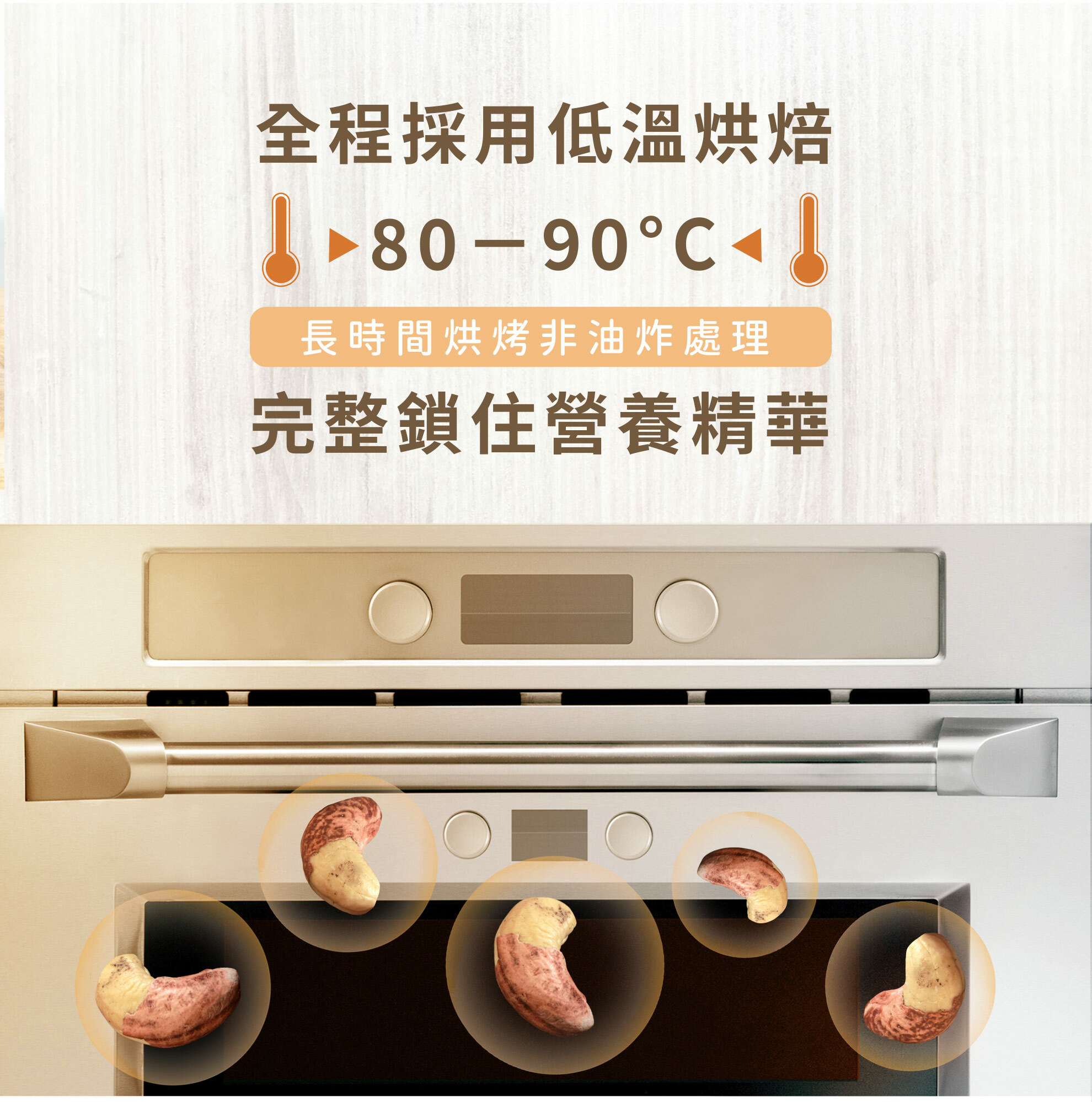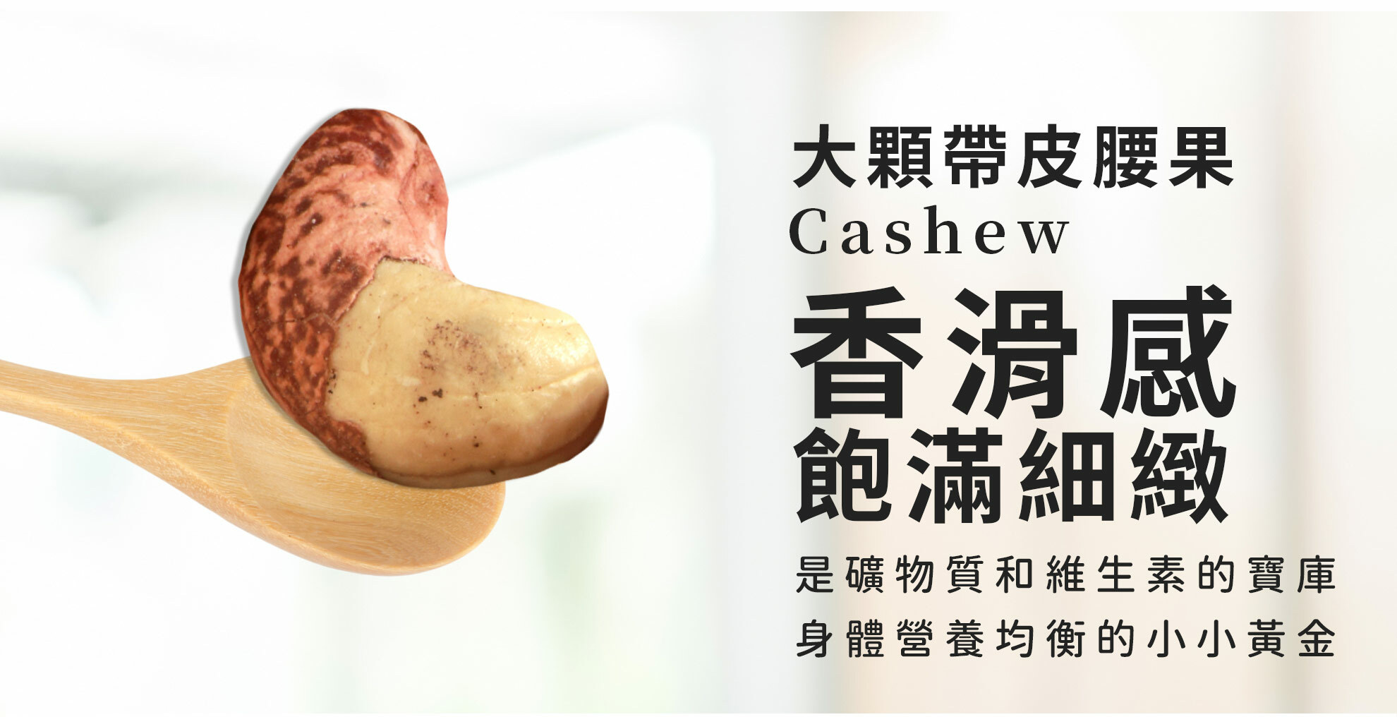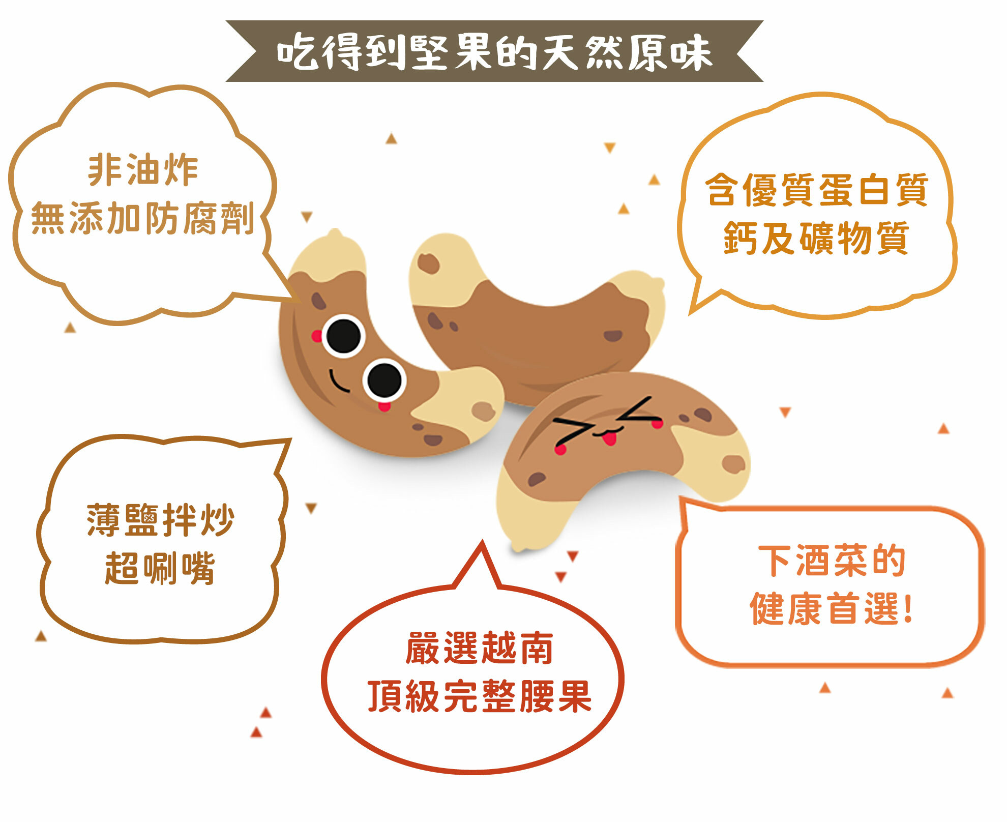 使用越南飽滿WW240大顆帶皮腰果,腰果富含蛋白質、胺基酸、亞麻油酸好油,帶皮腰果的外膜含有更豐富的維生素E營養價值,烘焙後以少鹽反覆拌炒,將果仁釋放鹹香,香脆好吃,外脆內香,風味具濃厚。