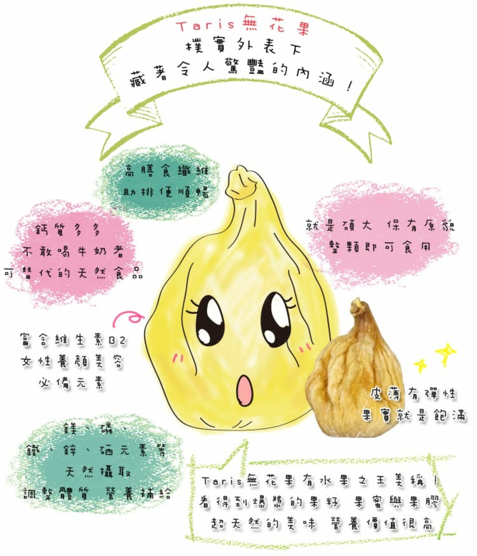 TARIS無花果乾果實碩大,果肉飽滿,果膠濃郁,果蜜濕潤,Q軟好吃不膩,無加糖、無防腐劑、無農藥殘留,100%純天然無花果乾,非來路不明經糖漬或漂白的無花果乾。