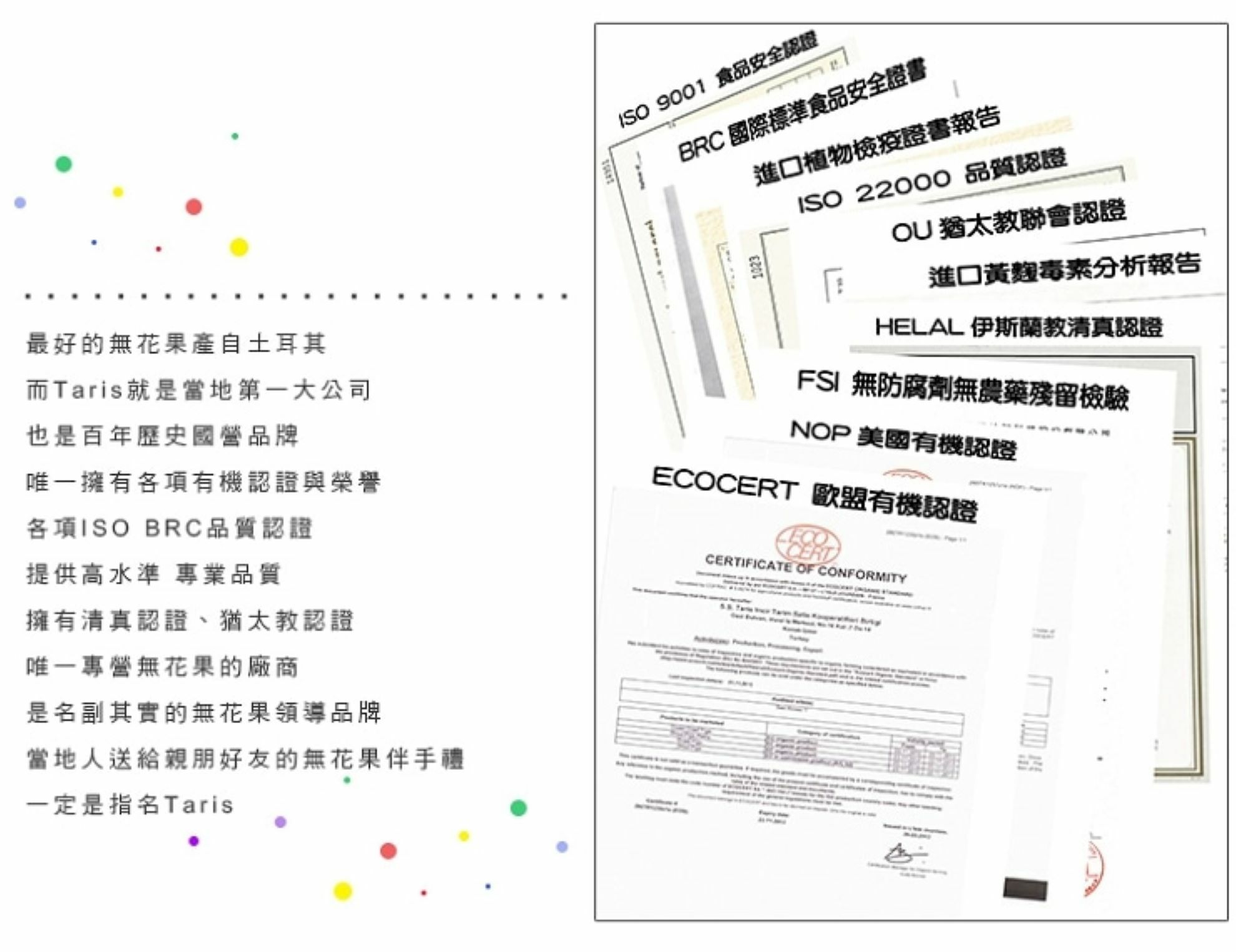 無花果乾權威品牌TARIS,為土耳其百年國營無花果乾生產商,選用當季個頭最大的高山無花果,每顆果實人工採摘,經天然風乾日曬後,多道嚴謹人工與機器篩選,符合歐盟法規對無花果乾高品質的要求,保留最美味營養的土耳其無花果乾。